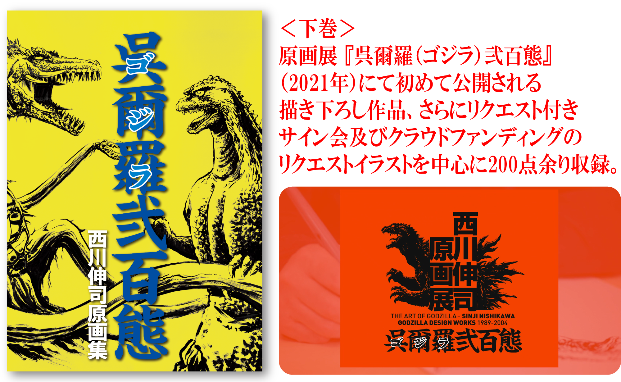 下巻は、『西川伸司原画展 呉爾羅(ゴジラ)弐百態』(4月28日から5月23日GALLERY 21で開催)にて初めて公開される描き下ろし作品と会期中に開催されるリクエスト付きサイン会及びクラウドファンディングでのリクエストイラストを中心に200点余りを収録。