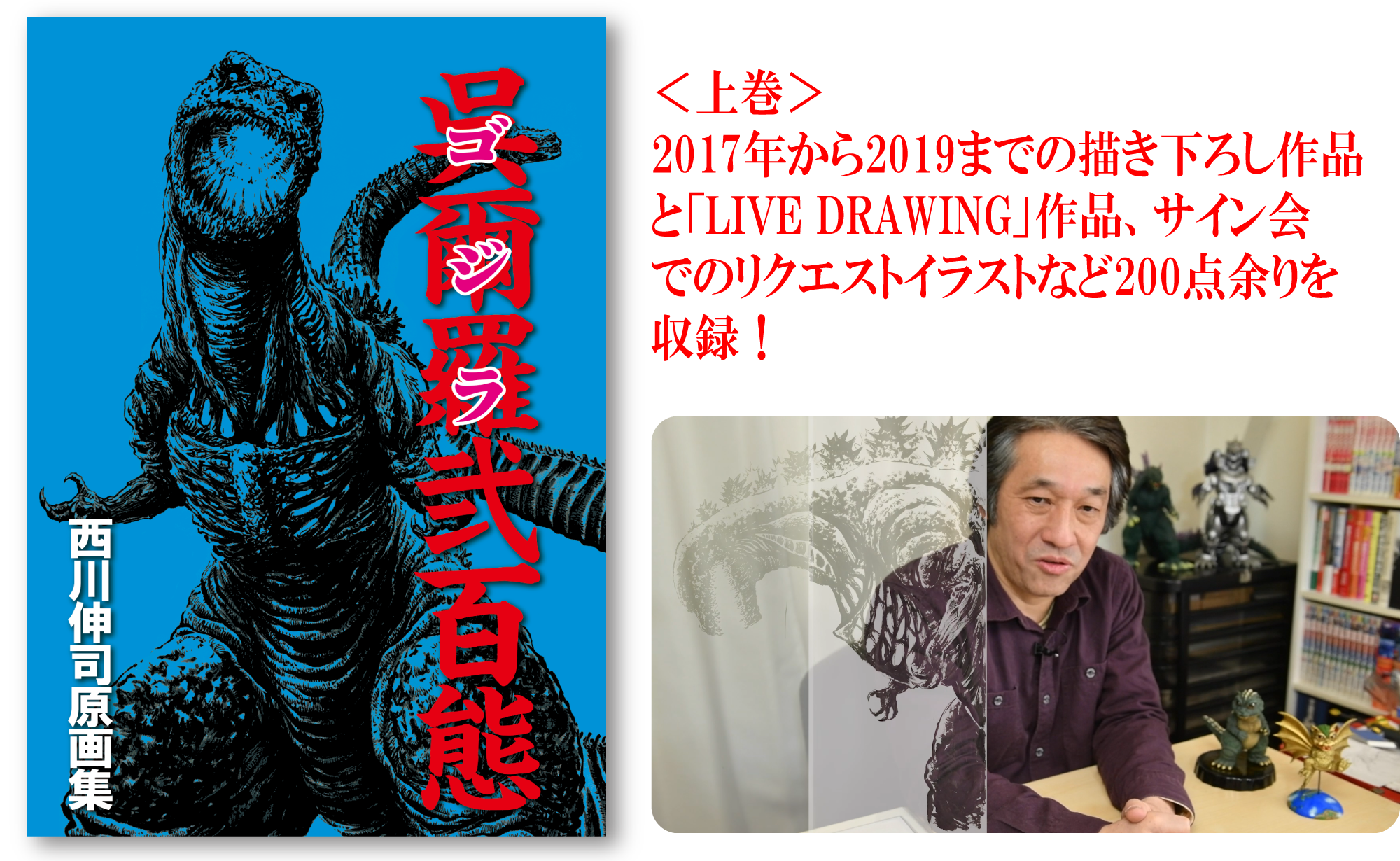 上巻は、2017年から開催された「GODZILLA GENERATION 生賴範義・開田裕治・西川伸司 3ILLUSTRATORS’ 咆吼」にて2019年西宮ガーデンズ分までに執筆された描き下ろし作品と「LIVE DRAWING」作品、サイン会でのリクエストイラストなど200点余りを収録!