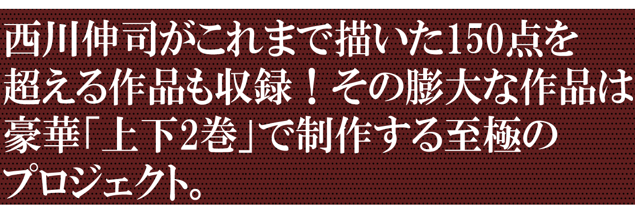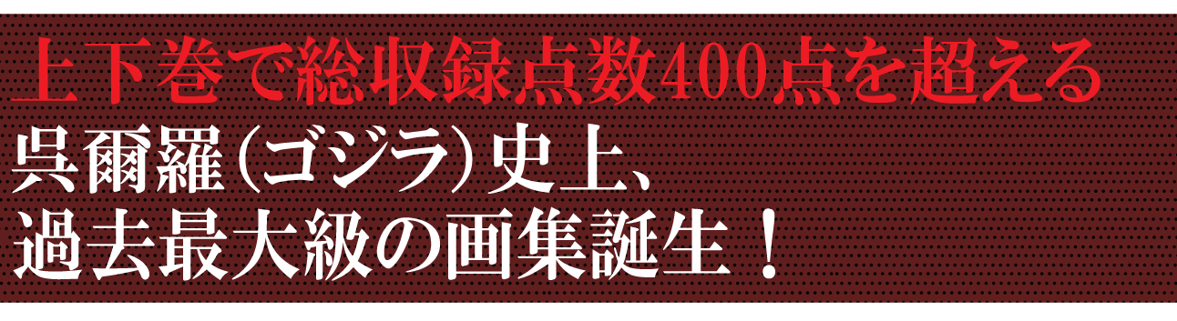 原画展では、西川伸司がその場で繰り広げる驚愕の筆画の「LIVE DRAWING」が行われ、とてもスペクタクルなエンターテイメントであり、瞬く間に目の前で描かれる数々のゴジラたち怪獣群は眼福なひとときです。今回の画集では、「LIVE DRAWING」 作品 がもちろん、西川伸司がこれまでに描いた150点余りの作品をはじめ、原画展「西川伸司原画展 呉爾羅<ゴジラ>弐百態」のために描き下ろされた初公開作品を完全収録いたします!その迫力の膨大な原画作品は1冊ではおさまりきらず、上下2巻で制作する至極のプロジェクトとなります。