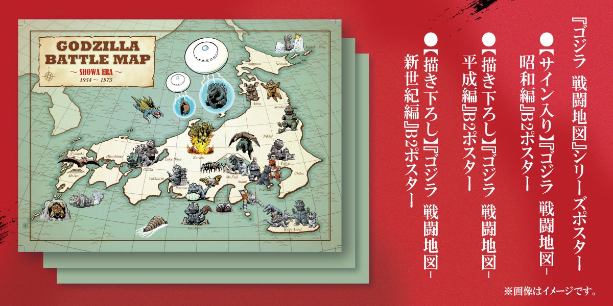 懸案だった『ゴジラ 戦闘地図-新世紀編』は、新たな取組みで関東中心にして描き下ろす予定です。今から見るのが楽しみです。“新世紀編”を迫力の大判で楽しめるのはポスターを注文した方だけになります。今回は、大人気だった昭和編のポスターも、直筆サイン入りでお届けします。昭和、平成、新世紀と3つの世界観がポスターとなってのお届けです。