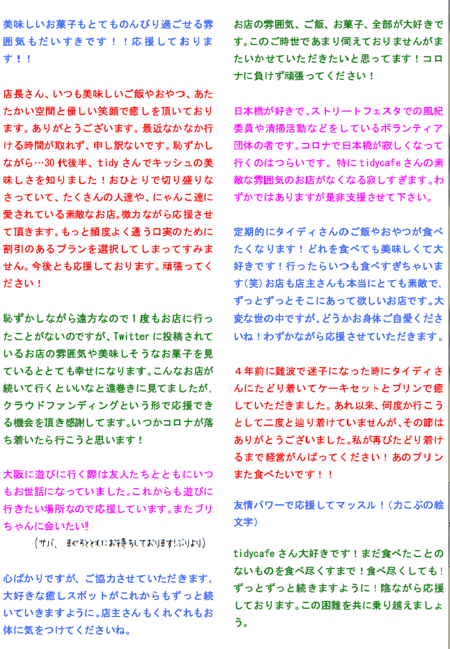 ご支援くださった皆様から頂戴した応援メッセージのなかから、一部をご紹介いたします。いつも来て下さるお客様、遠くから見守ってくださっているSNSのフォロワー様、こちらがお世話になっているばかりなのにご支援くださった地元団体の関係者さまなど、本当にありがとうございます。こちらにご紹介させていただいたメッセージのほかにも、あたたかいメッセージをたくさん頂戴しました。何度も読み返し、力をいただいております。本当にありがとうございます。