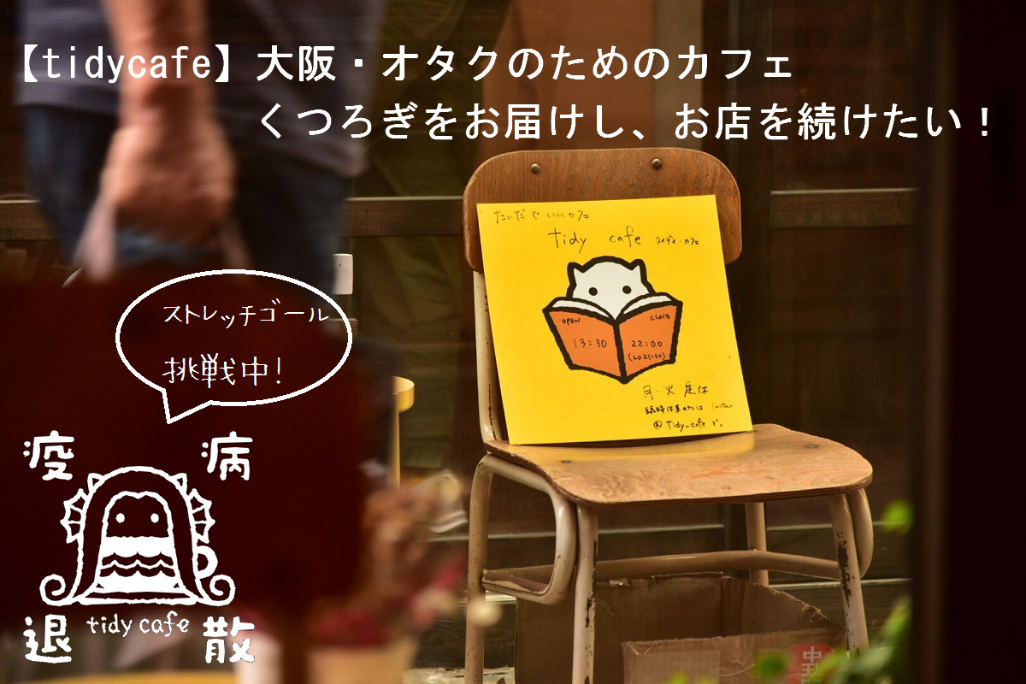 ご支援くださった皆様へお世話になっております。tidycafe店主です。お礼が大変遅くなりましたが、この度は、当店のプロジェクト「【tidycafe】大阪・オタクのためのカフェ くつろぎをお届けし、お店を続けたい!」にご支援を賜り、本当にありがとうございました。皆様のあたたかいご支援により、延べ支援者さま数 342名さま達成率216%支援総額2,168,300円という結果を得ることができました。最初の目標を一晩で達成させていただいたことを含め、何もかもが私にはもったいないですが、いただいたご支援や応援を必ず活かし、お客様がそれぞれの大好きなものをこころゆくまで楽しみ、くつろぎのお時間を過ごすことができるカフェとして、精進していきたいと存じます。これから、皆様へのリターンの製作、発送をすすめてまいります。ただいま早速、お礼状やグッズの入稿をしつつ、ご送付先などお預かりした大切な情報を慎重に整理しております。リターンの発送については、プロジェクトページに記載したスケジュールに間に合うよう、鋭意準備し、発送準備が出来次第、都度こちらのキャンプファイヤーを通じたメールでお知らせを差し上げます。また、リターンに選択肢があるものについては、時期が参りましたらご案内を差し上げます。また本来あってはならないことですが、リターン発送の遅延が生じそうなときは、できるだけ早くご連絡をいたします。コロナの影響で各方面平常時とは違う状況が生じていることに鑑み、ご了承いただけましたら幸いです。さて、次のリターンにつきましては、その性質上、リターンの到着前でも特典をご利用いただけるようにいたします。⑨カフェお代金・ギャラリー・フリースペース利用料5%オフコース⑩カフェお代金・ギャラリー・フリースペース利用料10%オフコースこちらのご支援者さまにつきましては、当店にご来店の際、こちらにございます名簿と照合して割引サービスをさせていただきますので、ご来店の際、ご本人確認ができるものをお示しくださいませ。その他のリターンにつきましては原則お手元にリターンが到着後のご利用をお願いしたいのですが、⑯はじめてのお客様歓迎!tidycafe満喫コースや、一部のコースに含まれるワンドリンクチケットなどにつきまして、遠方のお客様など、ご予定上リターンの到着前にご使用になりたいときは、お手数ですが事前にこちらのメッセージやTwitterのDMでご相談くださいませ。できる限り対応させていただきます。このプロジェクトで皆様にいただいたお気持ち、生涯忘れることはありません。本当にありがとうございました。tidycafe店主(ここまで、支援者のみなさまに送らせていただきましたメッセージの再掲です。)支援者の皆様はもちろん、こちらのプロジェクトにご興味をお持ちくださりこのページをのぞいてくださった皆さま、SNSで拡散してくださった皆さま、折々にあたたかい励ましをくださった皆さま、そして、的確なアドバイスをくださり不慣れな私でもプロジェクトを達成できるようお力添えをくださったCAMPFIRE事務局のご担当者の皆さま。すべての皆様に感謝しております。本当にありがとうございました。この状況が落ち着きましたら、みなさまを是非お店でお迎えしたいと思っております。いつか、直接お礼を言わせてください。tidycafe店主