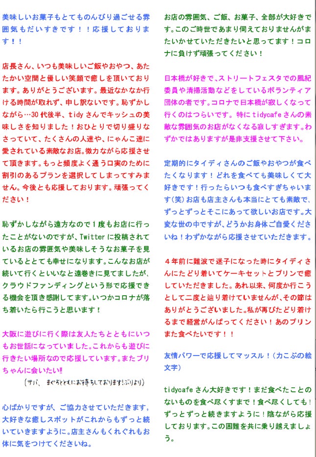 ご支援くださった皆様から頂戴した応援メッセージのなかから、一部をご紹介いたします。いつも来て下さるお客様、遠くから見守ってくださっているSNSのフォロワー様、こちらがお世話になっているばかりなのにご支援くださった地元の団体の関係者さまなど、本当にありがとうございます。こちらにご紹介させていただいたメッセージのほかにも、あたたかいメッセージをたくさん頂戴しました。何度も読み返し、力をいただいております。本当にありがとうございます。