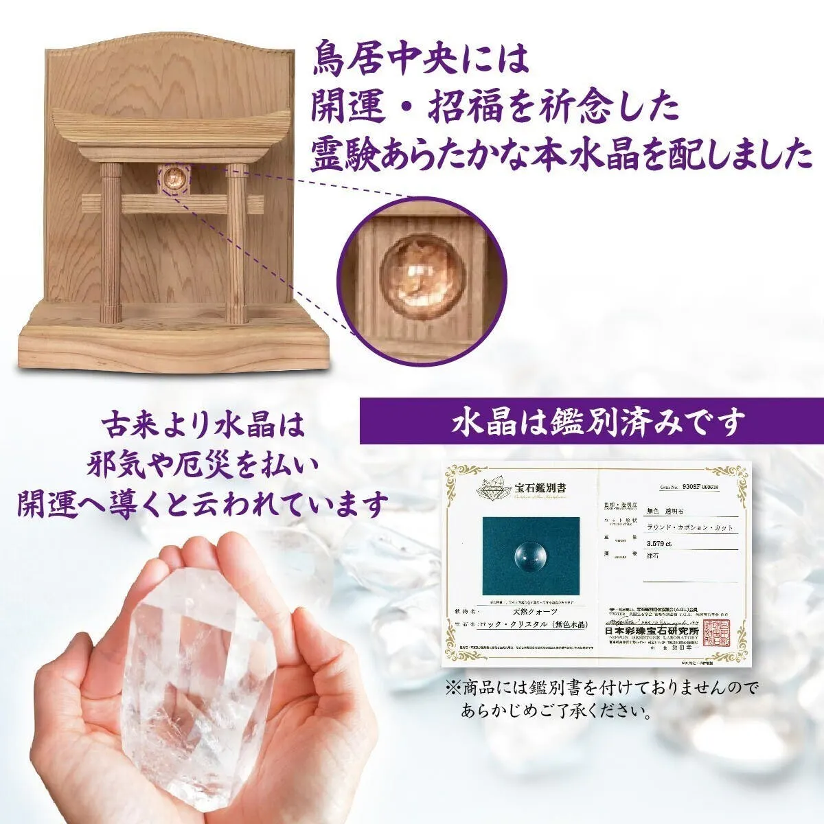 ◉本商品のもう一つの特徴は神域への入り口を示す鳥居を再現した造りと、浄化の石として知られる開運・招福を祈念した「水晶」を鳥居部分に配した事です。