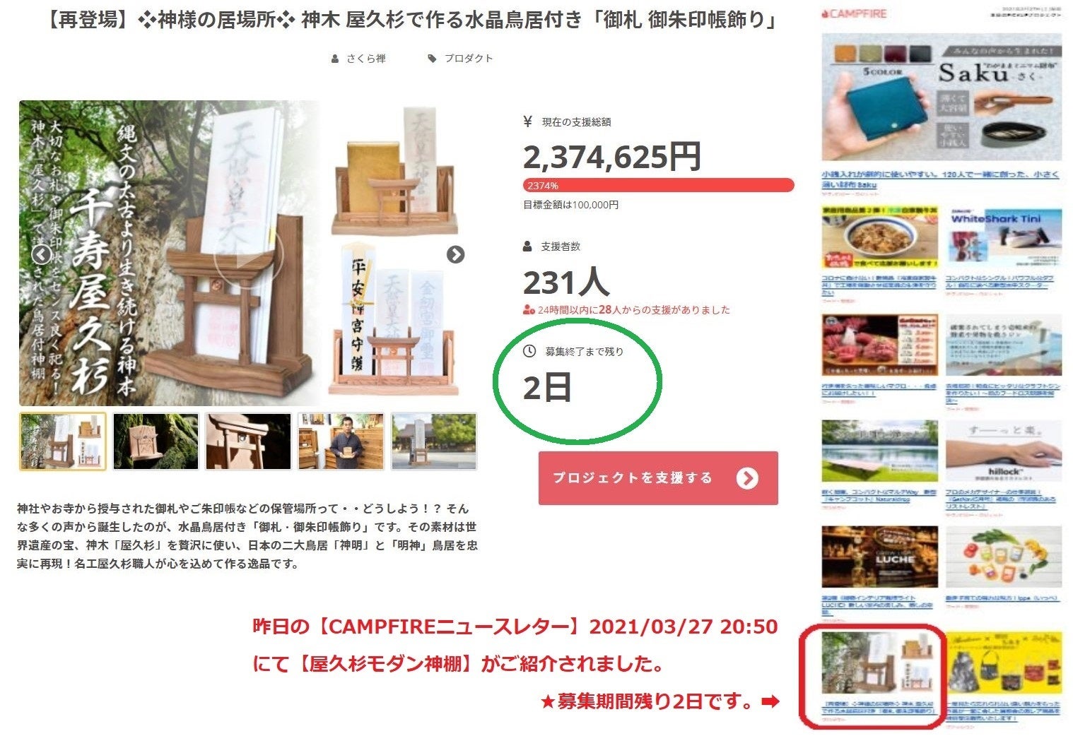 【再登場】❖神様の居場所❖ 神木 屋久杉で作る水晶鳥居付き「御札 御朱印帳飾り」プロジェクト事務局です。多くの皆様のご支援に感謝しお伝えいたします。<(_ _)>本プロジェクトも残すところあと2日!!昨日の20:50にCAMPFIREのニュースレターにて紹介されました!!一人でも多くの方に屋久杉の素晴らしさを広める為、ご支援者様にさらなるご協力を賜りますと幸いです。★下記のリンクを【 LINE・ツイッター・Facebook・インスタグラム・ブログ 】等で…1つでもシェアをいただければ大変ありがたいです。<(_ _)>https://camp-fire.jp/projects/view/371641何卒、宜しくお願い致します。
