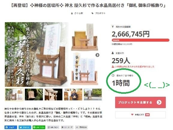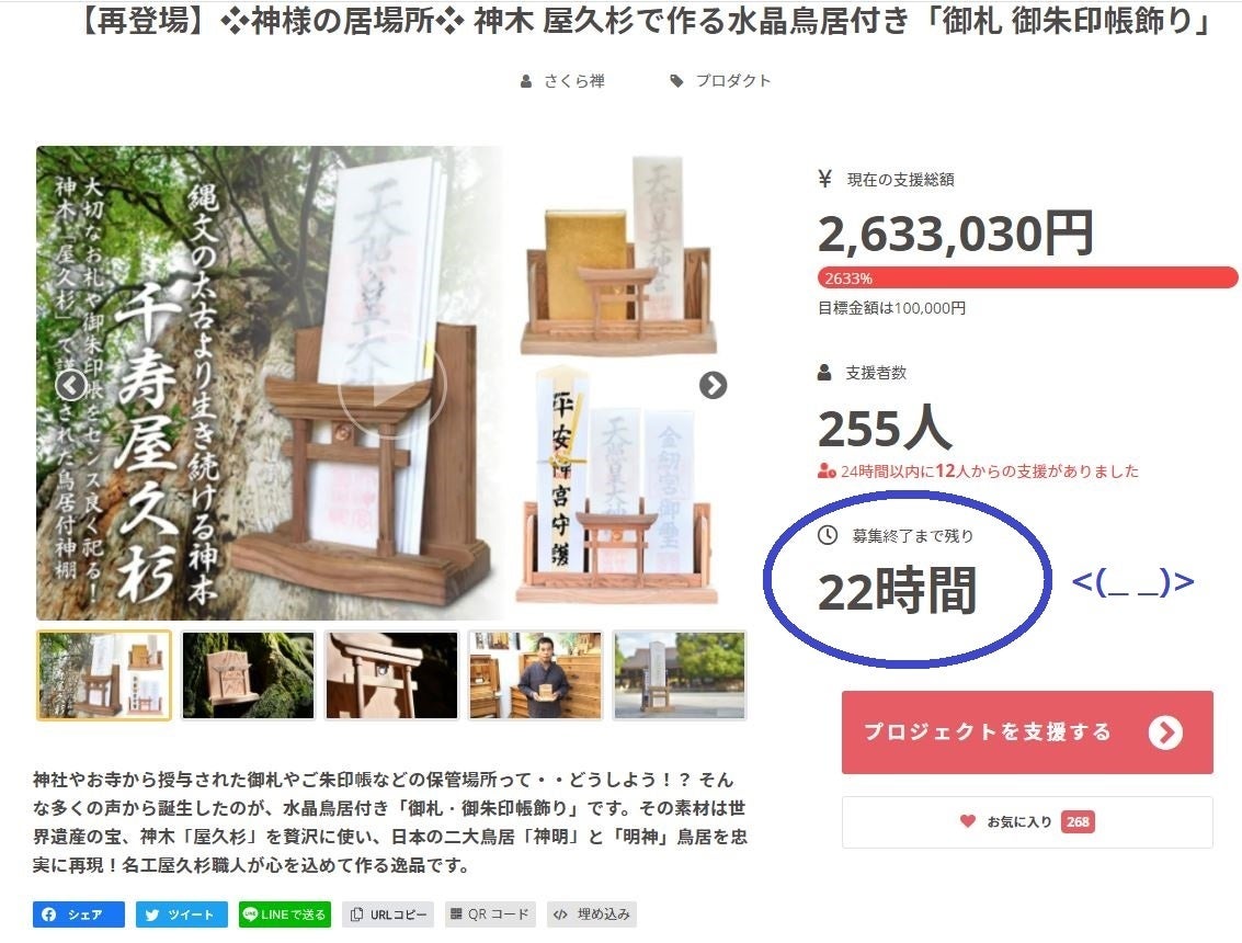 【再登場】❖神様の居場所❖ 神木 屋久杉で作る水晶鳥居付き「御札 御朱印帳飾り」プロジェクト事務局です。多くの皆様のご支援に感謝しお伝えいたします。本プロジェクトも残り★1時間を切りました。今までご支援を頂きました皆々様方に心より感謝しております。本当に有難うございました。<(_ _)>多くのご支援者さまにご幸運と最良の御利益・功徳を賜りますよう。心よりお祈り申し上げます。有難うございました。<(_ _)>https://camp-fire.jp/projects/view/371641
