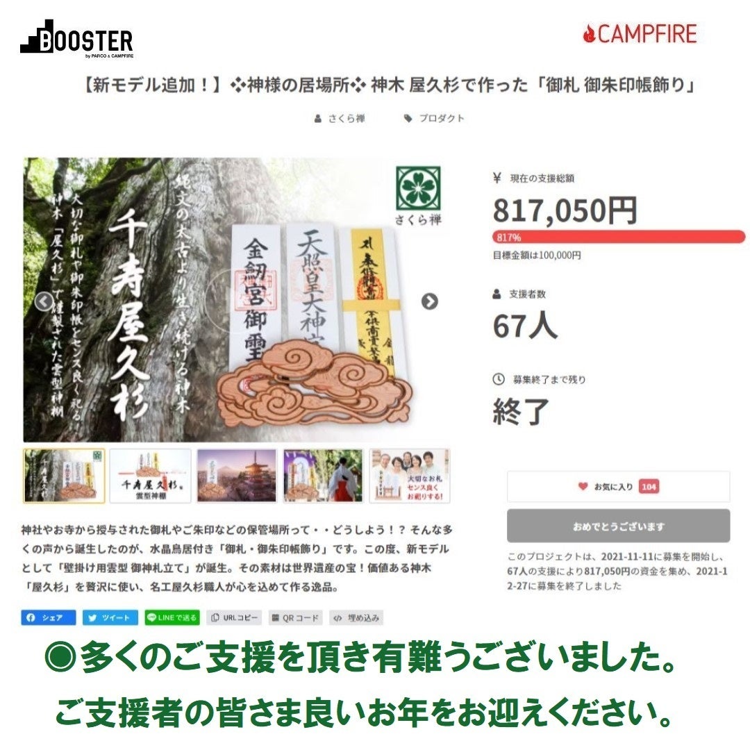 お世話になります。神木 屋久杉で作った「御札 御朱印帳飾り」プロジェクト事務局のさくら禅です。この度は多くのご支援を頂き、ご支援者の皆様には感謝の気持ちでいっぱいです。<(_ _)>早々、リターンの準備を進めておりますので、年明けを楽しみにお待ち下さい。ご支援者さまのご多幸とご健勝を心より祈念し御礼とさせていただきます。◉緊急開催のお知らせです。下記の新プロジェクトをSTARTさせて頂きました。https://camp-fire.jp/projects/view/538389コンセプトは先の屋久杉モダン神棚と同じとなりますが、よりお求めやすく年末年始のご参拝!初詣後のご準備にも間に合うプロジェクト期間の開催となります。https://camp-fire.jp/projects/view/538389★最後に来年こそ平穏な新年へ願いを込めて、皆さま良いお年をお迎えください。