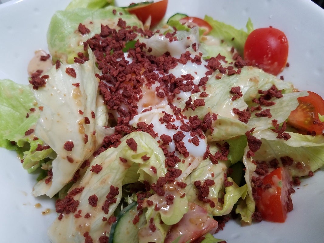 サラダの一番のこだわりは『量』です。大盛りサラダを推しにしております。価格も400円(ドレッシング別)です。というのも、私たち夫婦は歳をとるにつれて野菜を多くとりたくなってくるのを実感しております。が、どこのお店も大盛りのサラダを見かけることはありません。これは私たち夫婦が『これあればいいのになぁ』という視点から商品にしました。