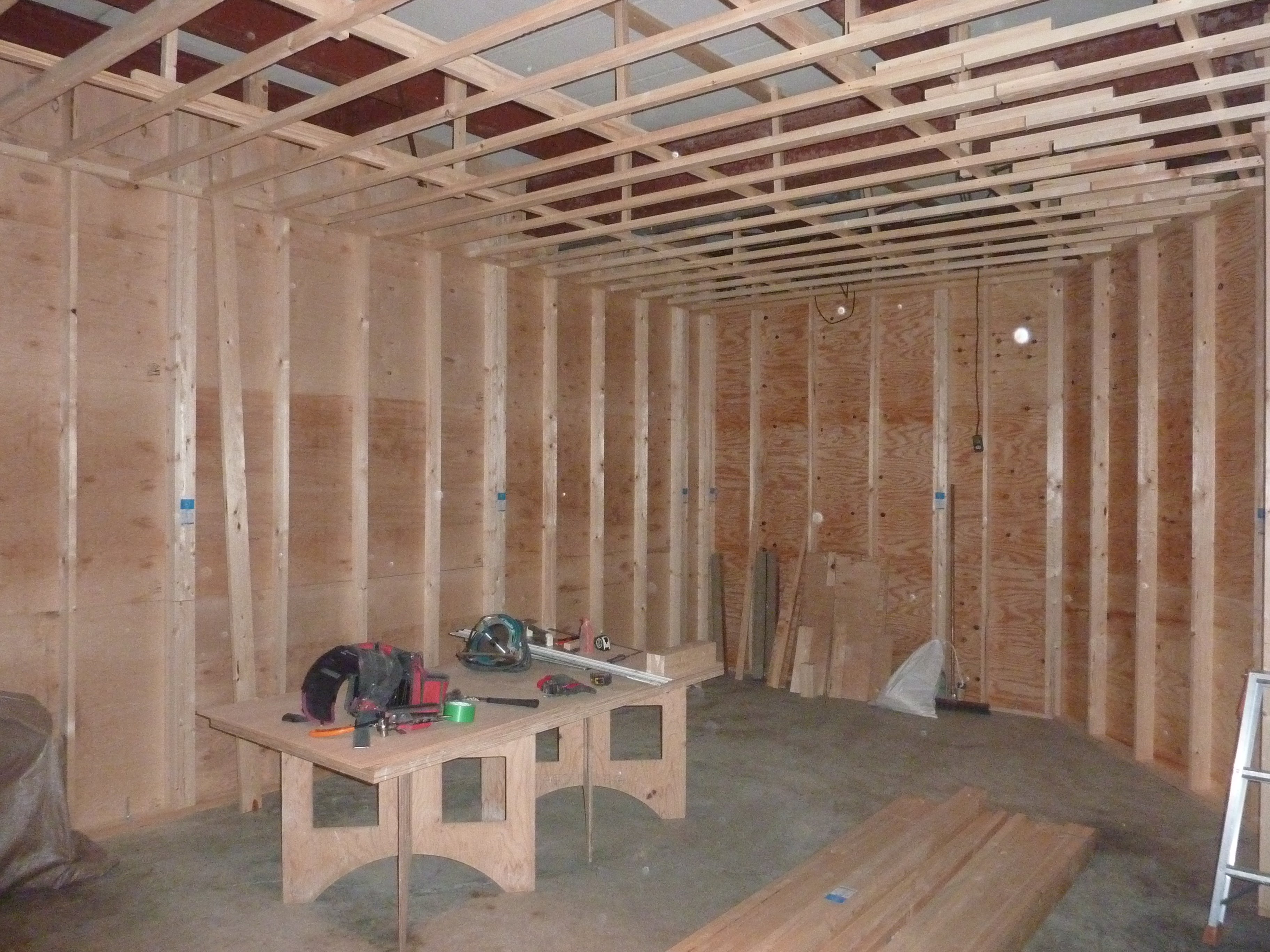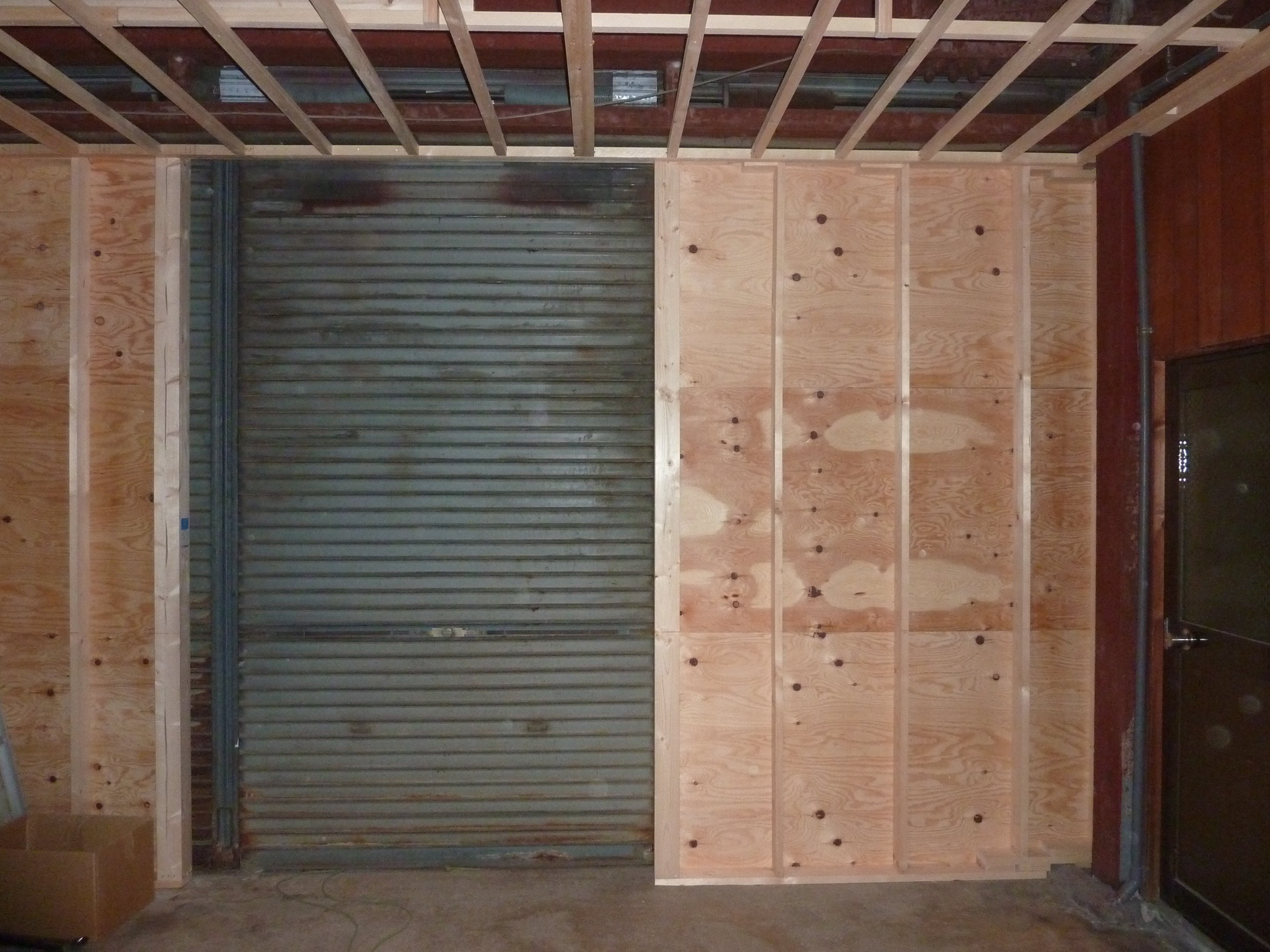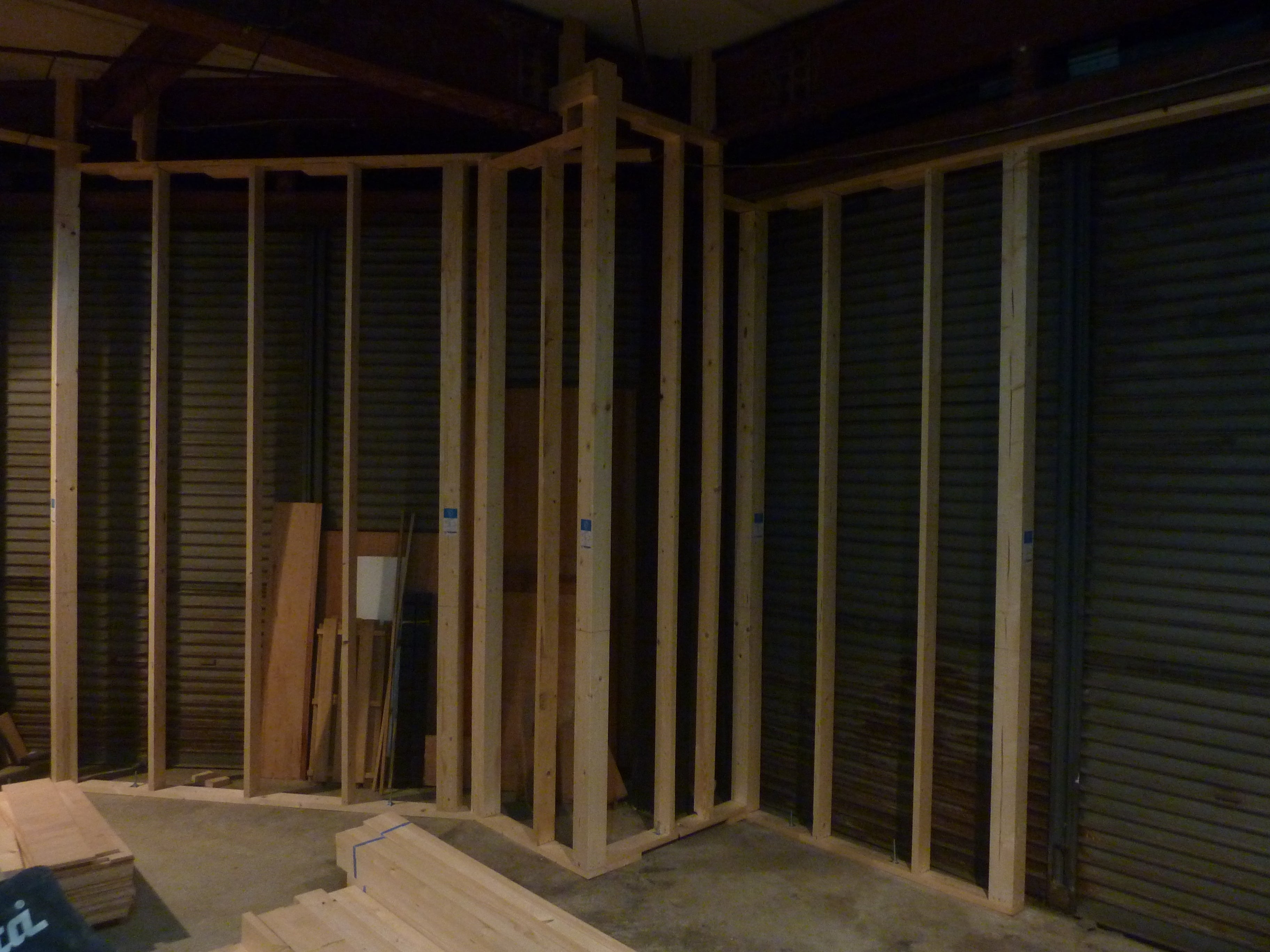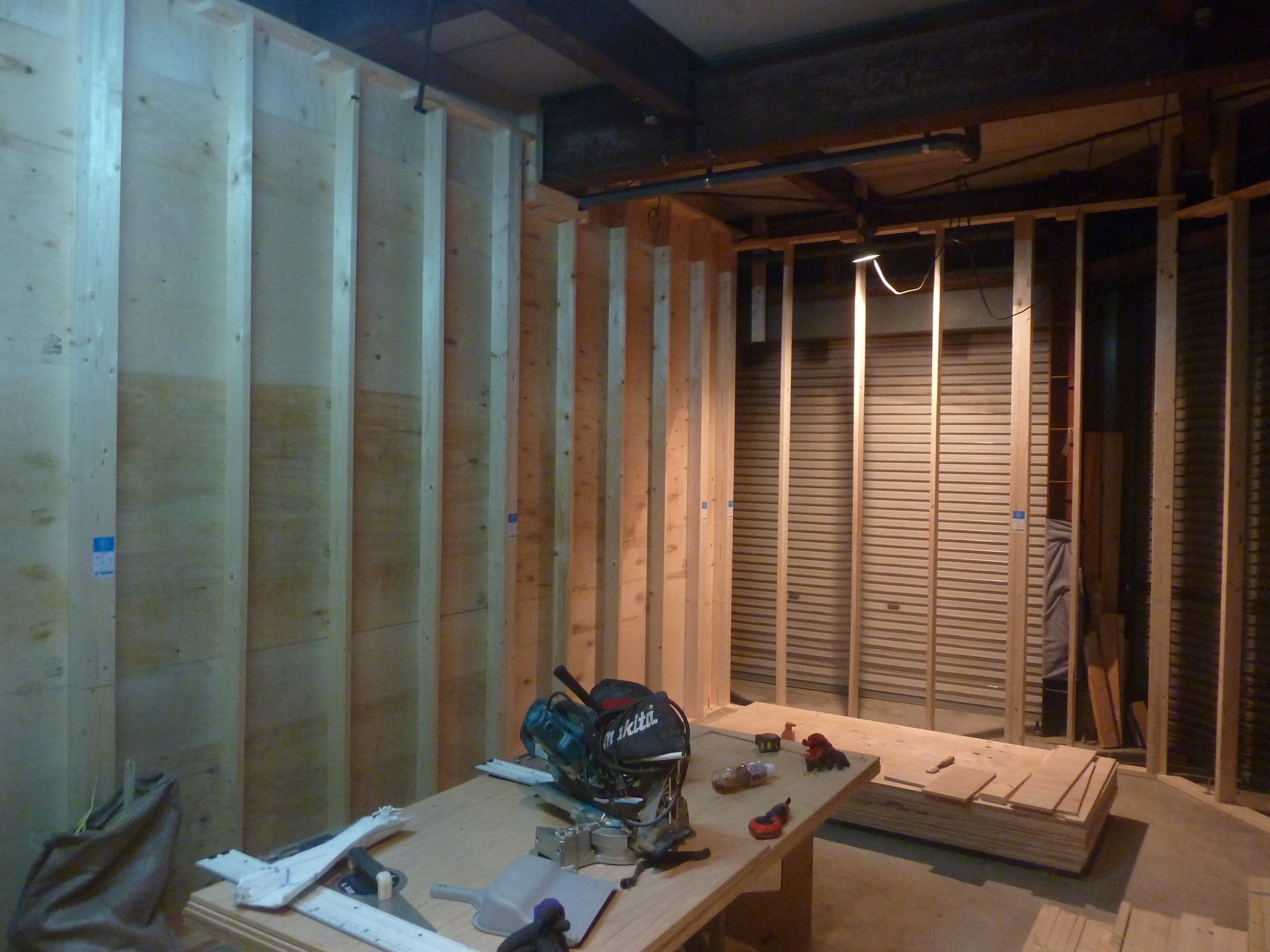 室内の側面の壁が凡そ出来上がり、天井も下地が出来上がりました。天井の板を貼る前に電気の配線等を仕込むそうです。次は道路側のシャッターを撤去して壁を作っていきます!何もない時は狭く感じましたが、壁が出来ると思っていたより広く感じとっても不思議です。