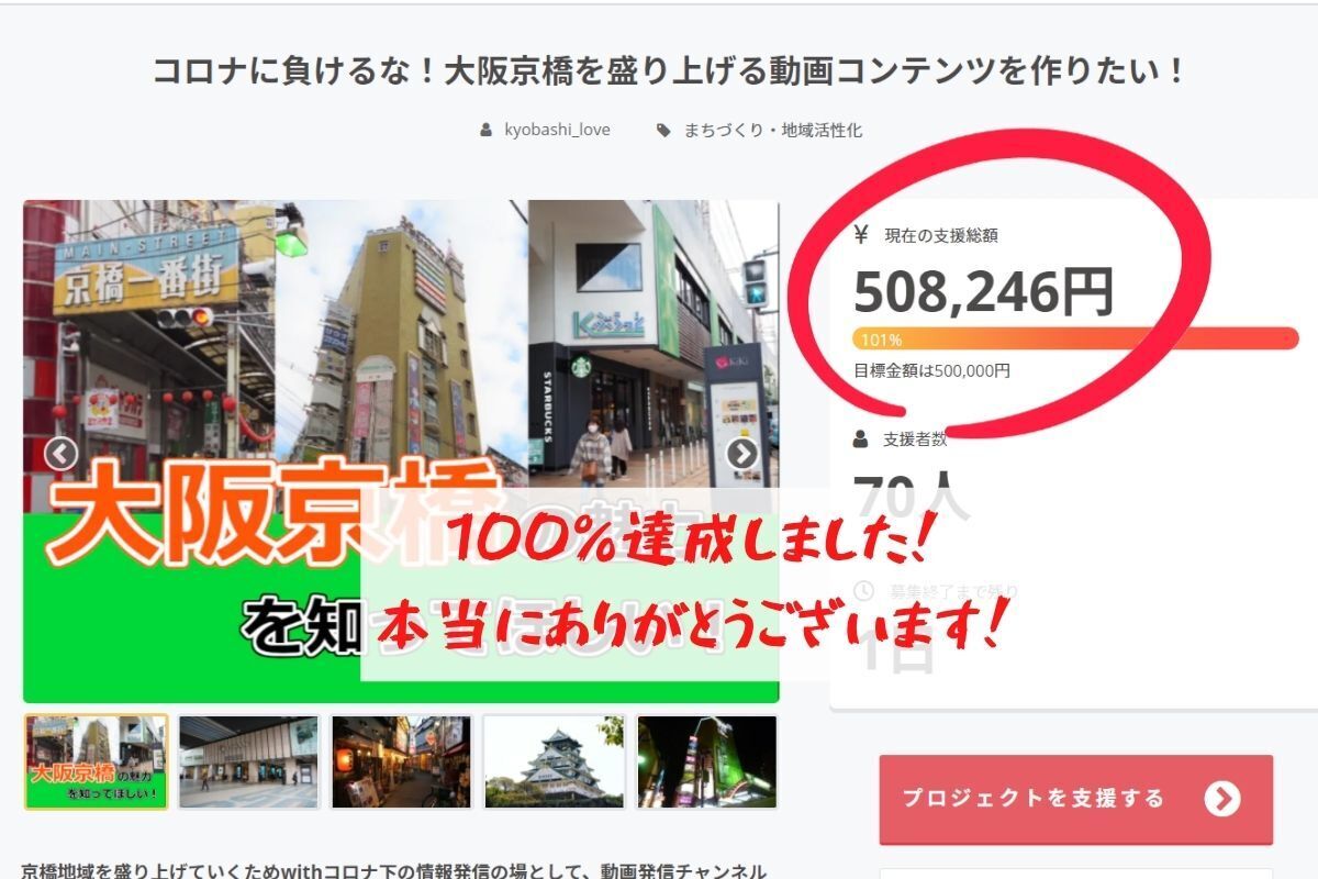 2021/03/29 11:36プロジェクト終了1日前にして、目標100%を達成することができました!これもひとえに、プロジェクトに支援いただいた皆様、プロジェクトの拡散にご協力いただいた皆様のおかげです。本当にありがとうございました。大阪京橋の街を応援してくださる方がこんなにたくさんいらっしゃることが、すごく励みになり、力になります。これから更に地域を盛り上げていこうと気持ちを引き締めるきっかけとなりました。京橋の「おもろい!」を発信していくで!ラスト一日、最後までプロジェクトを盛り上げていきたいと思います!改めて、よろしくお願いします!京橋地域活性化機構メンバー一同 もっと見る