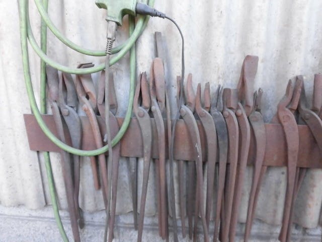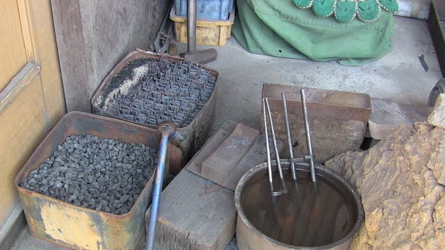 鍛造後は奥の四角の缶にナイフを差し込んで時間をかけてゆっくり冷却します。
