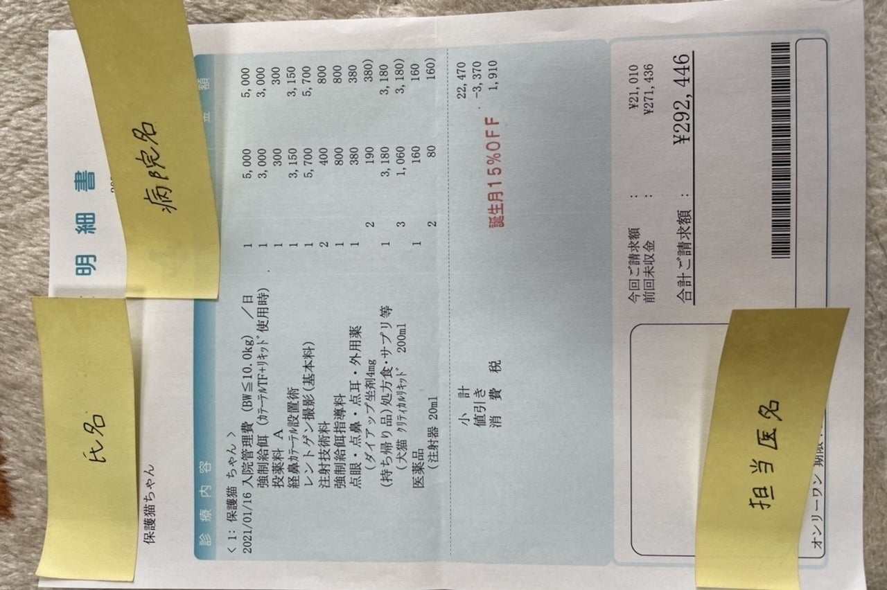 内訳や明細は、退院した時の合計の明細を掲載させて頂いております。今までの分はのりきらないため、後ほど活動報告の欄に初日の分から記載させて頂きます。
