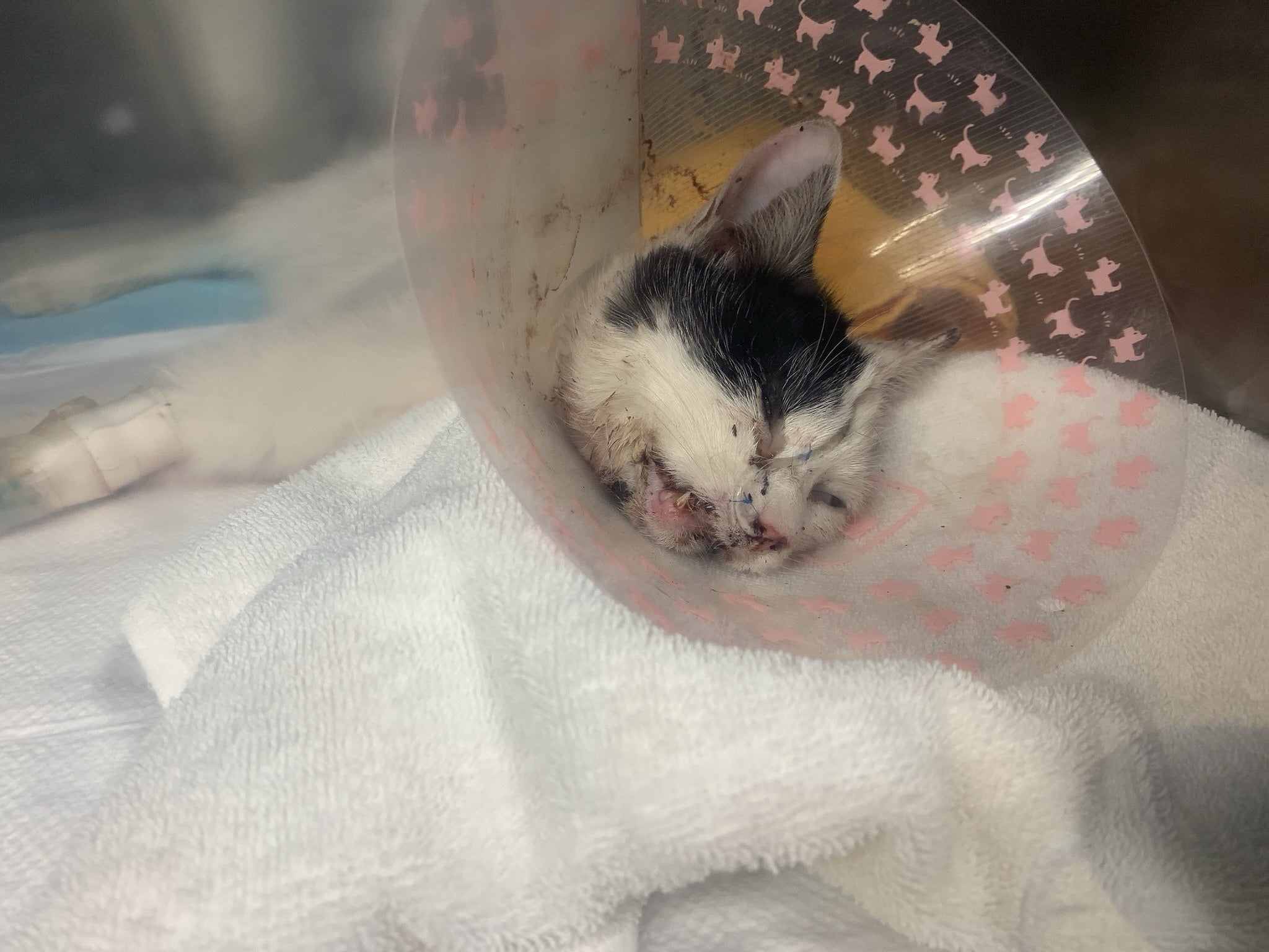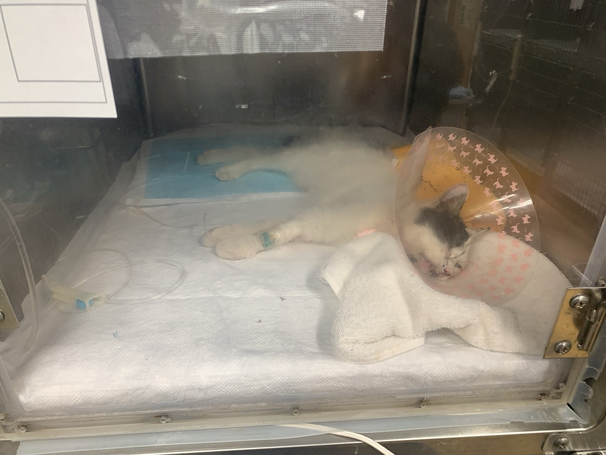 現在の状態はあまり良いものではなく、「顎の骨折」、「肺挫傷」、「脳圧の上昇」それにともない「発作」などがあります。詳しく検査をしようにも、猫ちゃんの体力がもたないためまだ詳しく検査が行えていません。そのため、これからもたくさんの疾患が発覚することも考えられます。