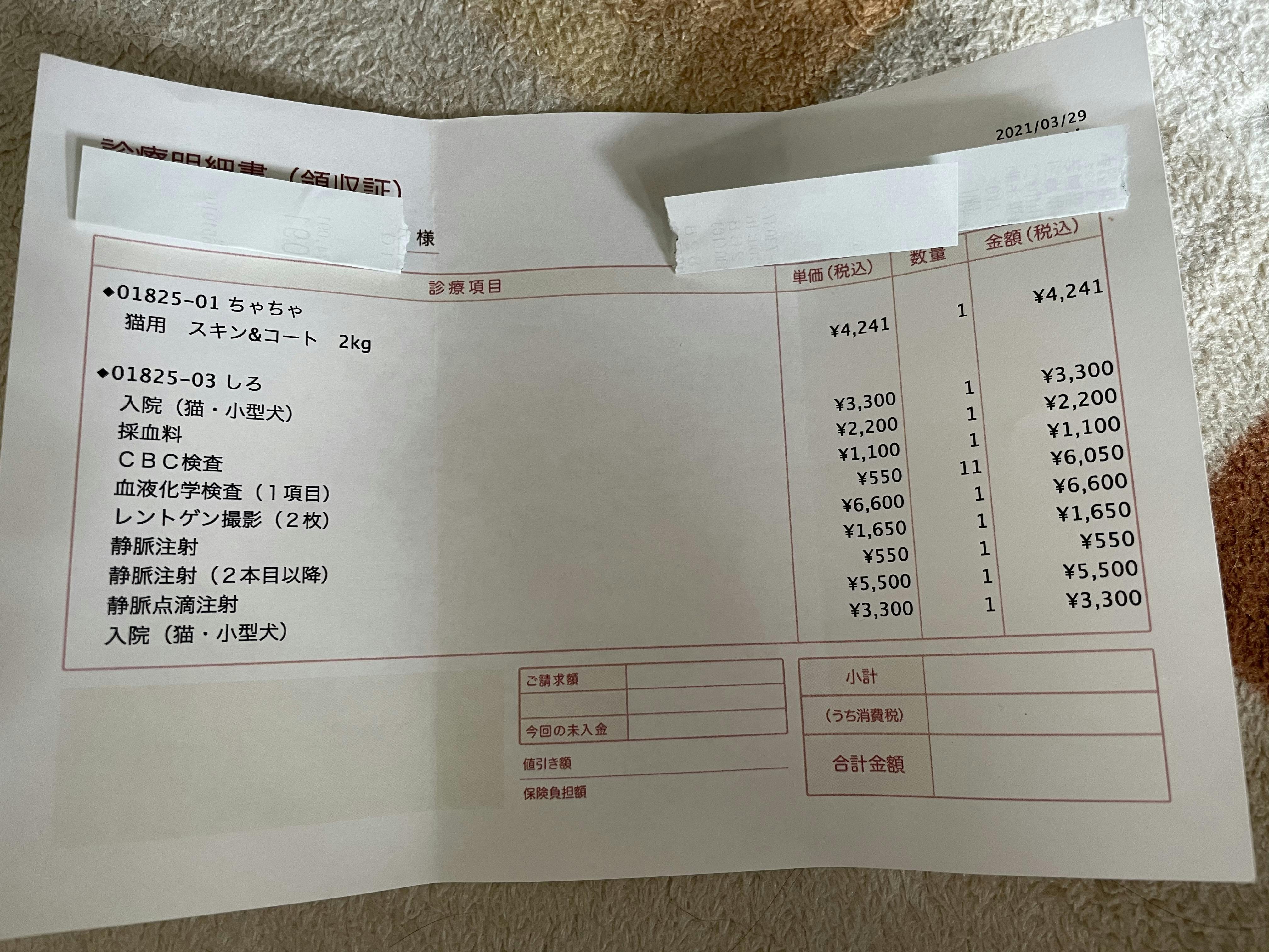金曜日から本日にかけてまでの入院費と薬の費用の明細です。見にくくて申し訳ありません。