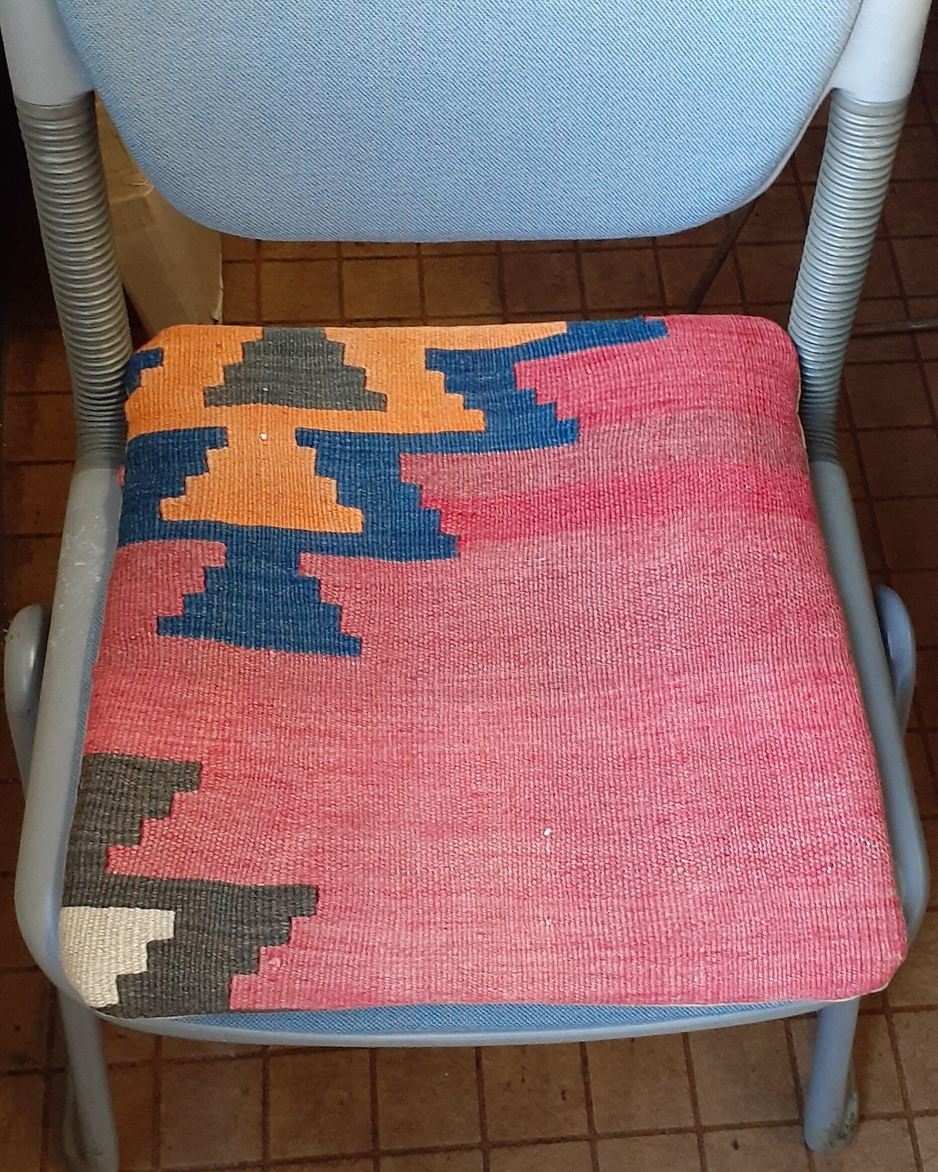 キリムのクッションカバーと当社の座布団の機能の結合です。このキリムはオールドキリム。捨てる前にカットしたりキルティングしたりして再利用します。これはサスティナブル、SDGsです。