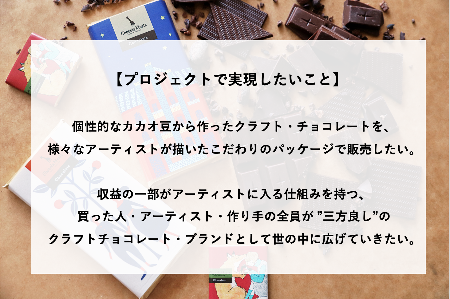会社を退社後に、この後説明する様々な出会いや経験が重なり、2020年1月に、今回のプロジェクトの起点である、様々なアーティストとコラボするBean to Barチョコレートブランド「Chocola Meets」の立ち上げ準備をスタートしました。