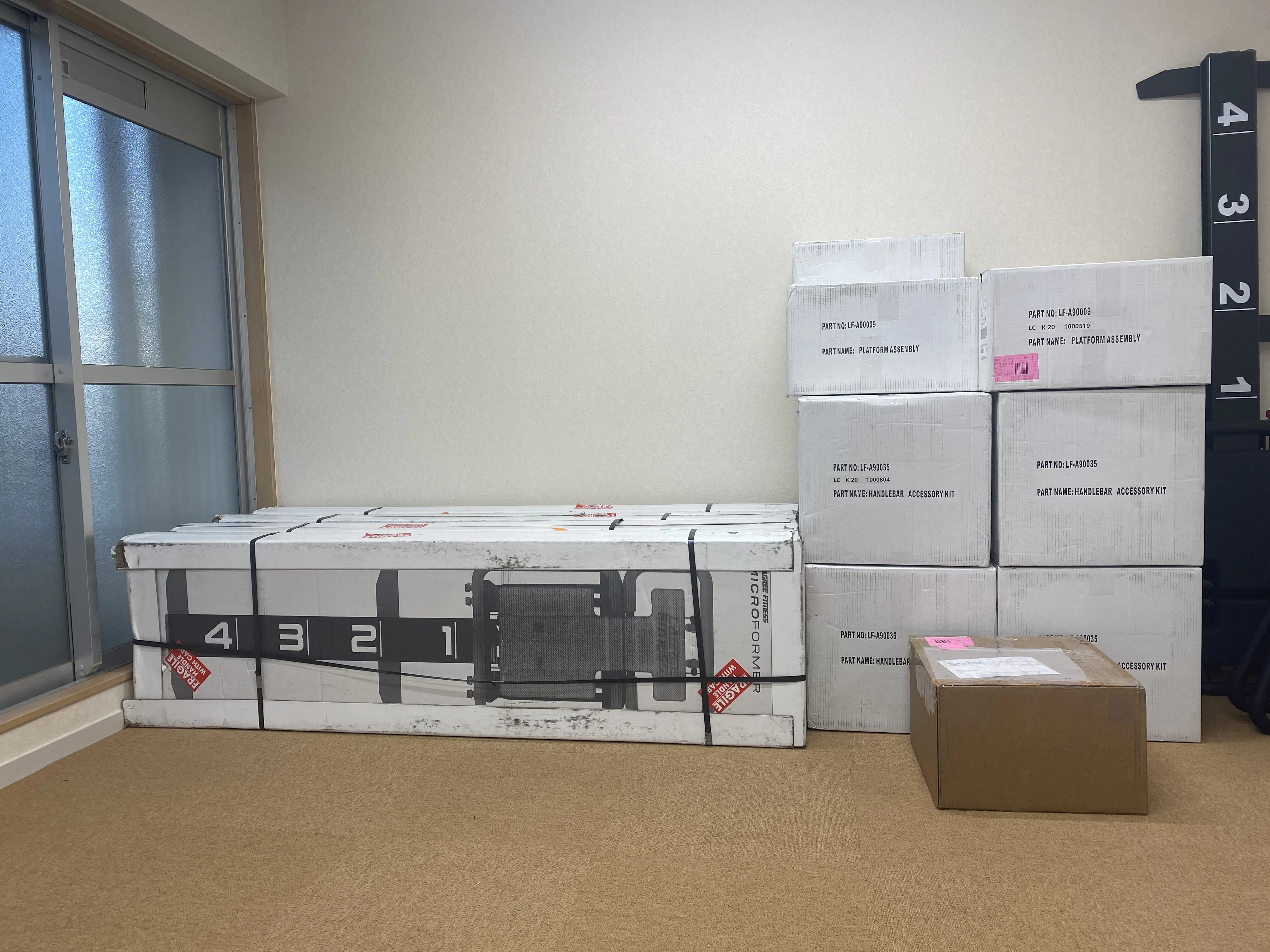 スタジオで使うマイクロフォーマーはハンドルやリアプラットフォームなど色々な付属品が付いているので段ボールの数が多いのですが、お返しの品にもなっている持ち運び用のマイクロフォーマーは、写真左側の段ボール一つで届きます。