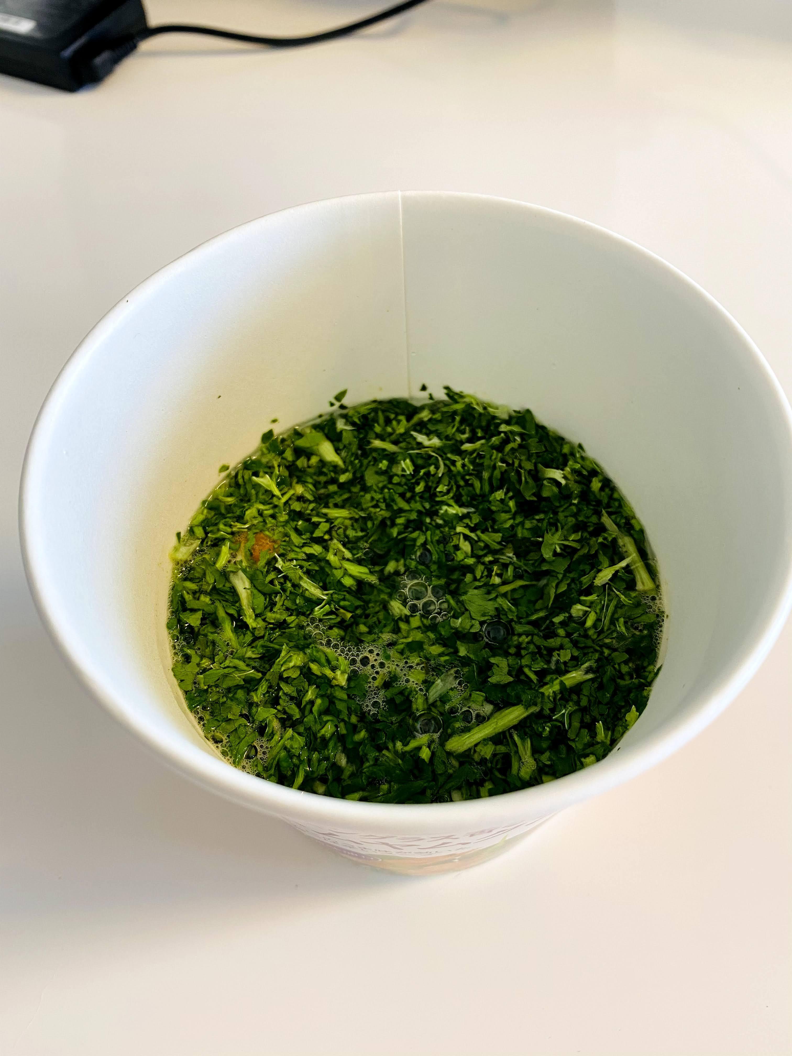 さっそく、このなかのトムヤンクンスープ味のフォーへ「乾燥パクチーリーフ」のサンプルをドサッ!と「追いパクチー」し、お昼に食してみました。