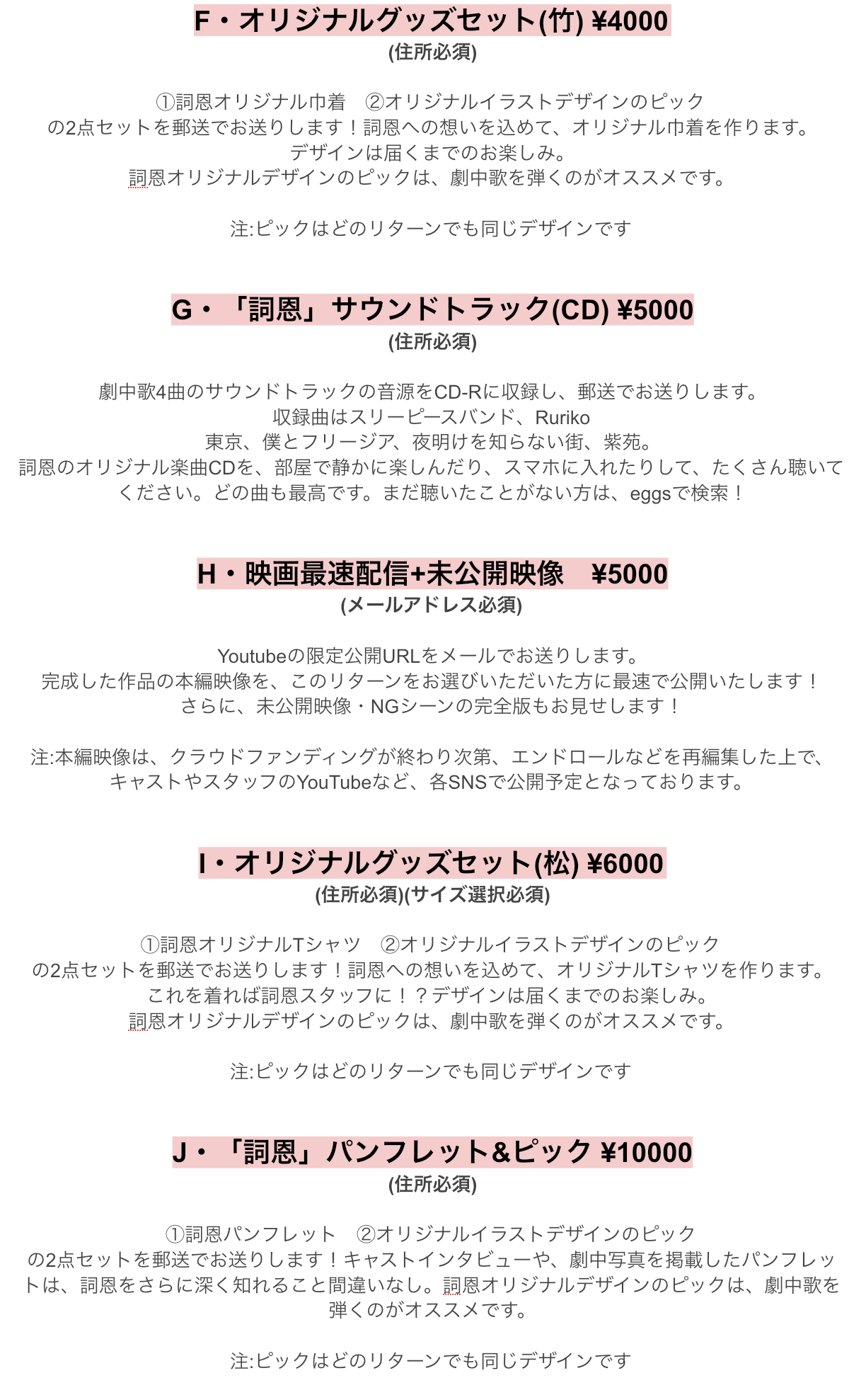 リターンによって、住所、メールアドレス、お名前などの情報を入力していただく必要があります。お間違えのないよう、指定の欄にご記入お願いいたします。