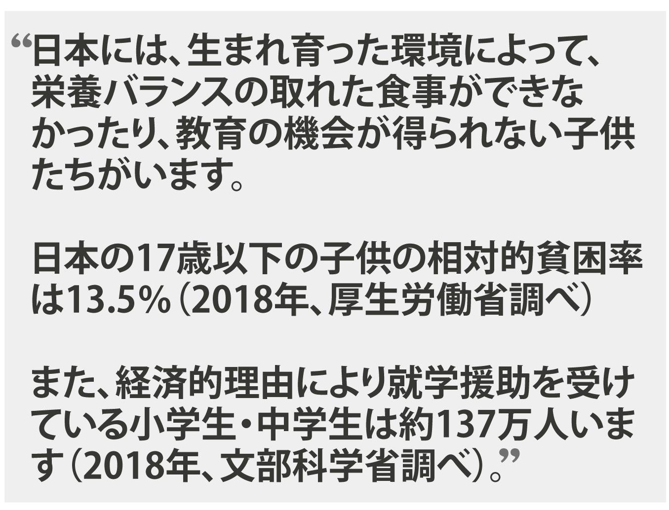 すべての子どもたちが、夢と希望をもって成長していける社会の実現を目指し、日本全体で子どもの貧困対策を推進する官民連携プロジェクト「子供の未来応援国民運動」 の取組です。