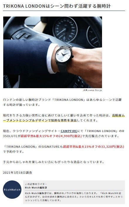 2021/03/19 22:54腕時計専門情報サイトRichWatch様に掲載頂きました!腕時計専門情報サイトに取り上げて頂けるとは、とても光栄なことで私達も嬉しく思います。ご訪問頂いた皆様にTRIKONA LONDONの時計のデザイン性の高さと素晴らしさを少しでも伝われば幸いです。この度はRichWatch様 ありがとうございました。詳しくは下記のURLから是非是非よろしくお願い致します。https://rich-watch.info/4042/ もっと見る