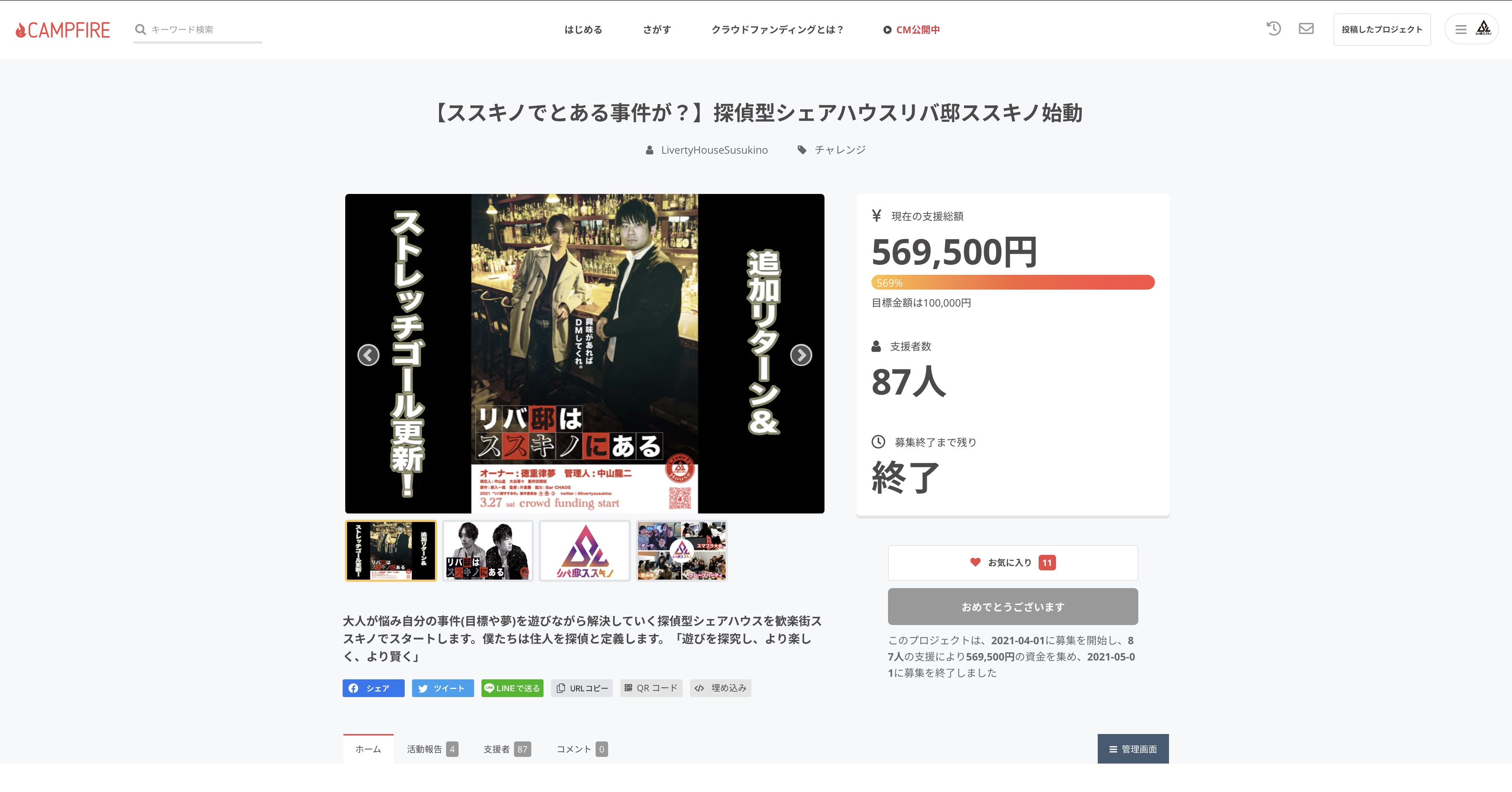 2021/06/03 22:05【プロジェクト終了及び感謝のお知らせ】 「【ススキノでとある事件が?】探偵型シェアハウスリバ邸ススキノ始動」プロジェクトが終了したので、こちらにて結果をご報告させていただきます。プロジェクト支援額:569,500円支援者数:87名※プロジェクト詳細はこちらからご覧いただけます。https://camp-fire.jp/projects/view/372170今回のプロジェクトは「遊びを探究し、より楽しく、より賢く」というコンセプトを掲げ、そのための人が集まる場所を作ろうというものだったのですが、当初の目標を大きく上回り、肉親から遠方の方まで本当に多くの方にご支援頂き、なんと申し上げればよいのか、感謝があふれ出てもう表面張力な訳でございます。すいません、本当にありがとうございます。目標金額はなんと開始4時間で達成しまして、目標の500%を超える支援が集まりました。マンションの一室の決して広いとは言えないコミュニティハウスを90人近い方々が応援してくれたのは感謝しかないです。住人のみんなにも改めて感謝です。ありがとうございます。7月頃には順次活動報告をアップしていくのでまた落ち着いてたらページにアクセスしてくれると嬉しいです。現在はリターン内容を一つ一つ確認していく作業中です。まだメールが届いていない方、もう少々お待ちください。正直なところ、「このご時世」(最近よく使われますよね)にコミュニティハウスとはなんだ、とか、そんなことやってる場合か、というような意見があったり、そういった目があったことも事実なのかな、と思います。しかし、こちら個人的な意見ではありますが、こういうご時世だからこそ、苦しいときに連帯できるネットワークがあることが本当に重要であるとも考えています。だからというわけではないですが、皆様からご支援いただいたこの「リバ邸すすきの」を本当によいものにしたい、と思いますし、していきます。余談ですが、クラウドファンディングを行った段階ではリバ邸すすきのは「日本で一番狭いリバ邸」だったようで、そういったところも今後のストーリーになればな、と思っています。また今後住人が増えていけば拡大移転も視野に入れています。どうか今後も変わらず応援をしてください!してもらえるように頑張ります!支援をはじめとして、シェアしてくださったり、来てくれたり、差し入れをいただいたり、色んな形で応援していただきました!より良い住環境、より楽しく遊べる場として整えさせていただきます。応援してくださったみなさま本当にありがとうございました!リバ邸すすきの一同 もっと見る