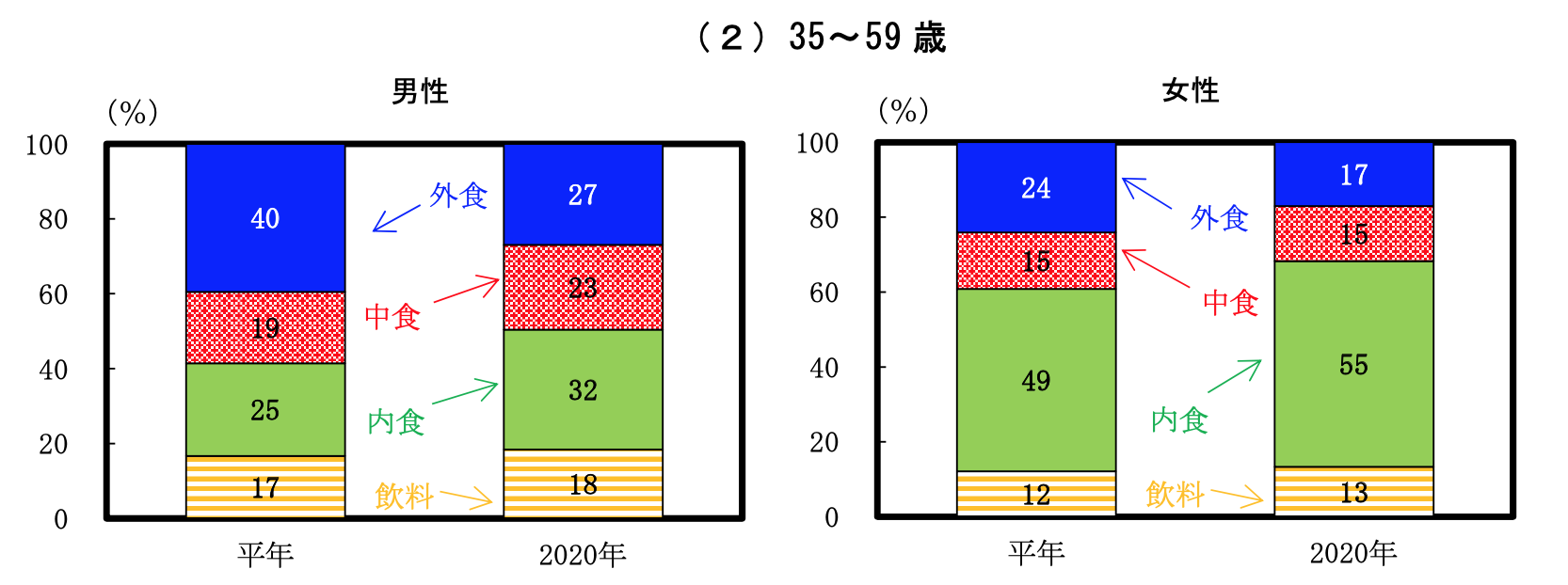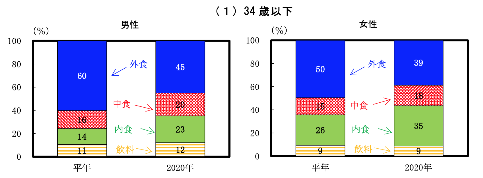 それによって、性別・年齢階級別でみた平年と2020年の食に対する割合の変化が下記の画像になります。
