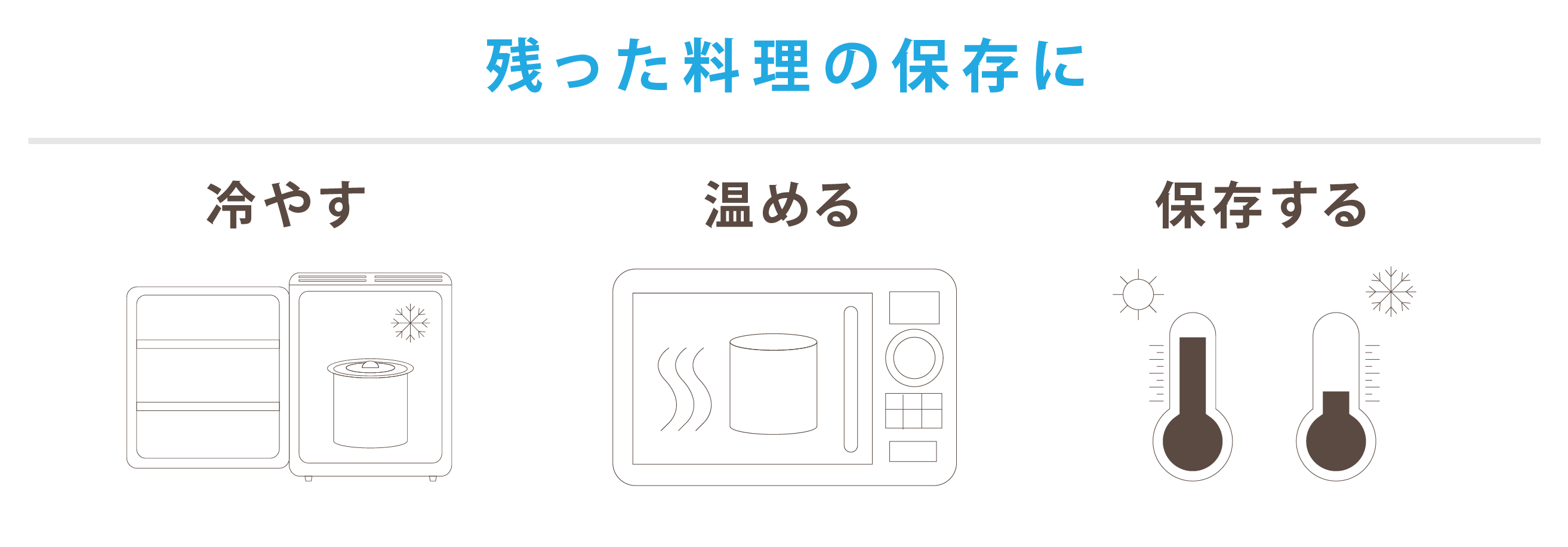 それぞれ磁器容器を分けて、残った料理を冷蔵庫で保存します。衛生面を考慮して、シリコン製の蓋を使用してください。食べる前に再び加熱します。8時間以上、食べ物を保温、保冷することができます。