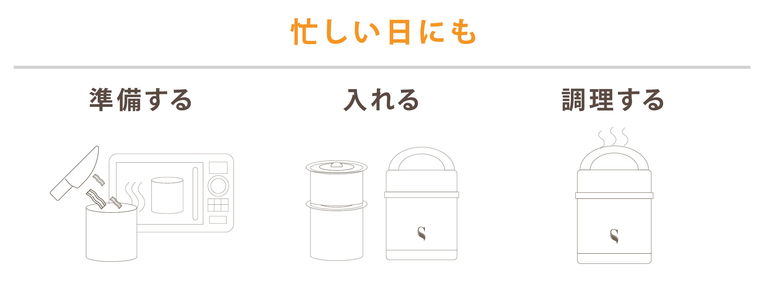 磁器製容器の中に食べ物を入れて、電子レンジで調理します*。一度に数種類の食べ物を重ねてレンジで調理することも可能です。食べ物から出る熱が真空断熱容器内を循環し、余熱で調理を継続したり、保温したりします。