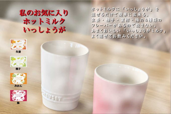 *ホットミルクに入れる砂糖の代わりに「いっしょうが」を入れると牛乳臭さも抜けておいしいですよ。4つのフレーバーがあるので何度でも楽しめます。