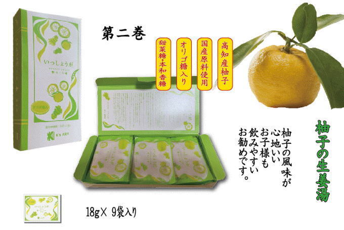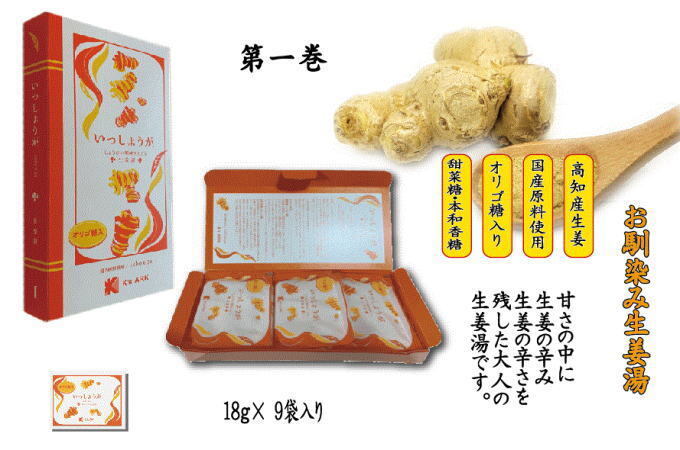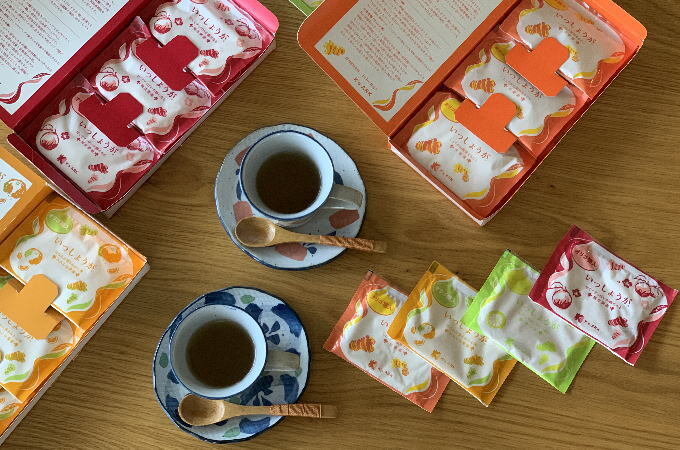 「いっしょうが」は、4種類のお味がございます。本をイメージしているので、生姜湯を1巻とし柚子茶を2巻としています。3巻は、みかん生姜湯、4巻は梅生姜湯です。いずれも高知県産生姜が入っている生姜湯です。お好みでお試しください。今後も新たなフレーバーを加えていきたいと思っています。