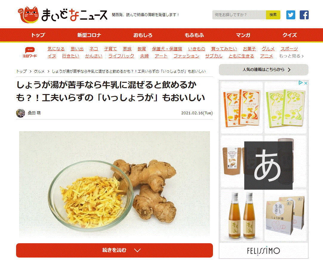 2021/02/18 10:01先日取材を受けた神戸新聞社の記事が、まいどなニュースで配信されました。この記事は、Yahooニュースなど大手のメディアにも配信されています。是非ご覧ください。まいどなニュース,いっしょうが,生姜湯 もっと見る神戸新聞社様から取材を受けました(2/9)