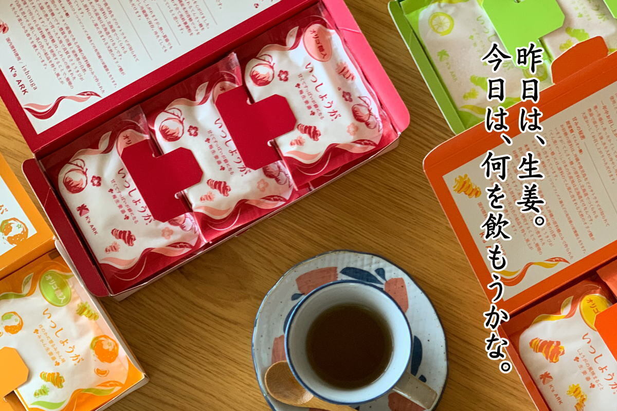 粉末で小分けされているので、いつでも簡単に楽しめます。台所の奥にしまわれる生姜湯も「いっしょうが」は、リビングや書斎が置き場です。冬だけでなく年中楽しめる様、”生姜湯を表舞台に”がコンセプトの「いっしょうが」です。何卒宜しくお願い致します。