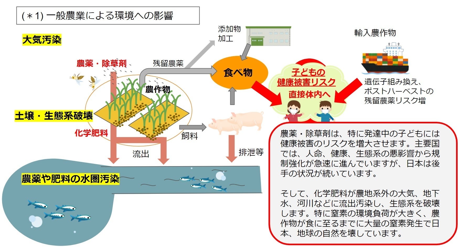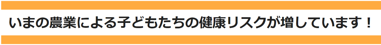 皆さまはご存じでしょうか。日常の生活ではあまり目や耳にする機会が少ないですが、慣行農業による残留農薬(除草剤)や添加物摂取による人体への影響、化学肥料による環境問題等(*1)、日本の食と農の安全は脅かされ、子ども達の健康リスクが日に日に増大しています。