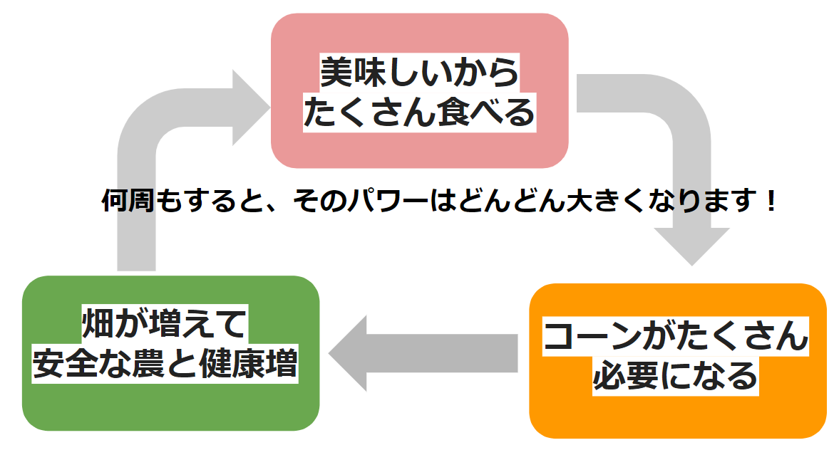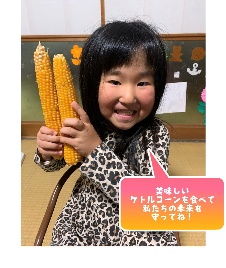 ケトルコーンをたくさんの子どもたちが食べて需要が増えることで、耕作放棄地の活用を進めていき、安全な国産ポップコーンの安定供給を図ります。