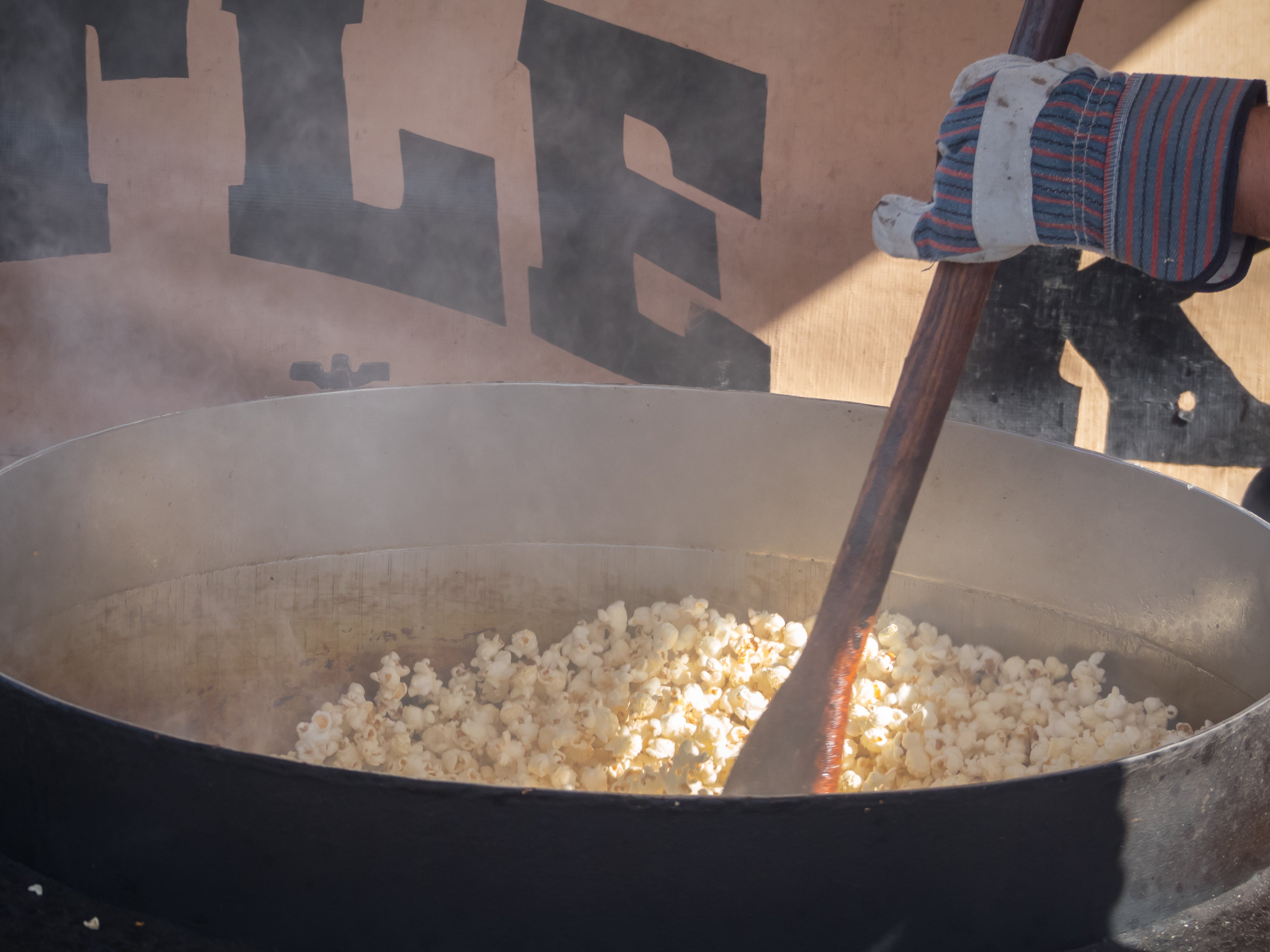 「ケトル」というのは、「やかん」という意味ですが、ケトルコーンは本来、やかんが大きくなったような鋳鉄大鍋と大ヘラを使って、ダイナミックに手作りでポップさせるので「ケトルコーン」と言われています。