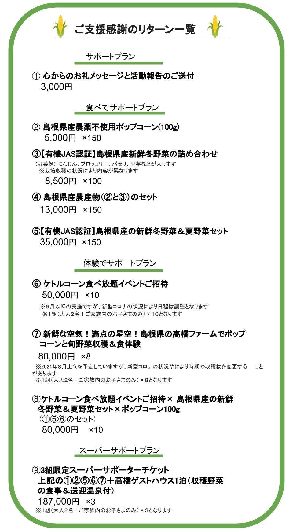 クラウドファンディングでご支援いただいた資金は、島根県ポップコーン畑の拡張整備費およびキッチンカーの製作費(首都圏エリア)の一部、クラウドファンディング手数料に使用させて頂きます。その他のプロジェクト費用は、自己資金等で対応します。