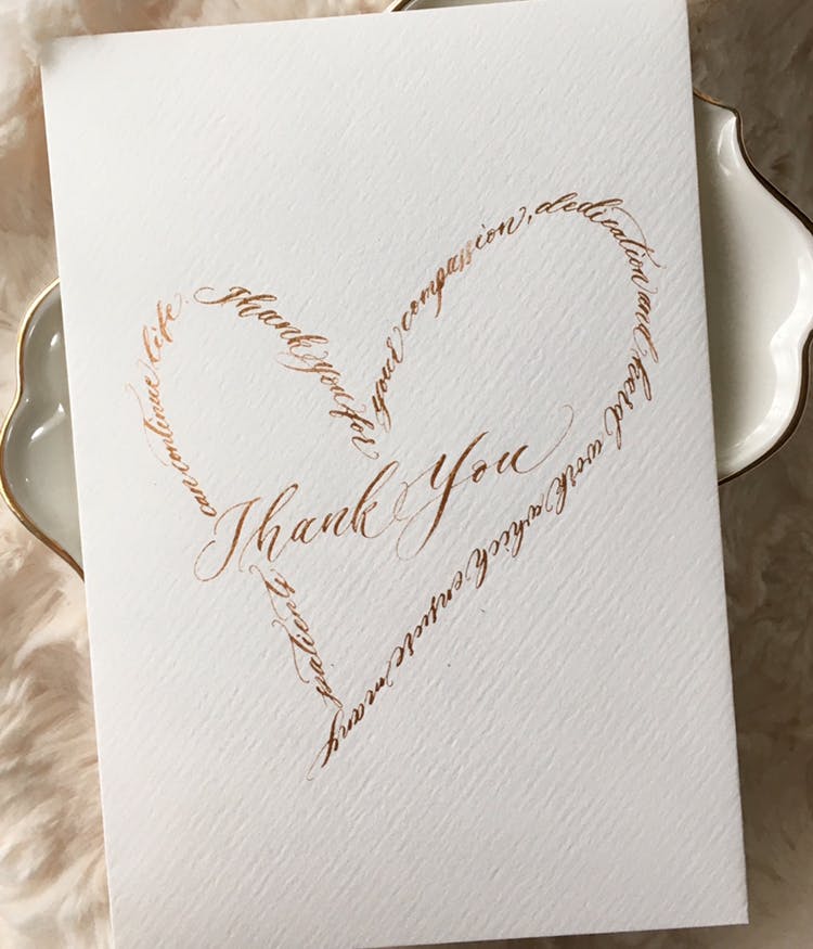 もうすぐヴァレンタインも近づいています。ヴァレンタインのチョコレートを購入する時間も無いだろうと想像し、チョコレートに加え、目で楽しめる薔薇のプリザーブドフラワー、免疫力アップ&エネルギーチャージのためのマヌカハニーのど飴、入浴剤、そして手書きのカリグラフィーでハートを形どったカード(現物の写真になります)に、医療現場への応援メッセージを書いて、ギフトボックスにして病院に送ります。
