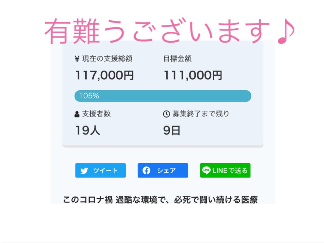 2021/02/05 23:01応援くださった皆様、無事に目標金額達成致しました。温かな応援、本当に有難うございます^まだプロジェクトの最終日までお日にちがございますので、今後さらに応援頂きます分は新たな都内の病院に追加で送らせて頂く予定です^頂きました皆さまのメッセージも、一部抜粋して同封させていただきます。最後まで、引き続き、宜しくお願い致します^ もっと見る
