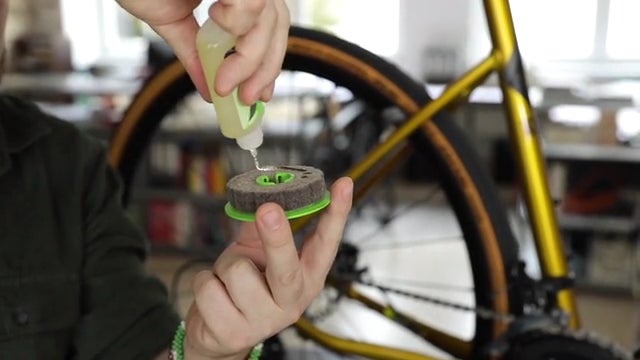 ④自転車のチェーンにlubricator wheel(リューブリケーターホイール)をあて、ペダルを回します。