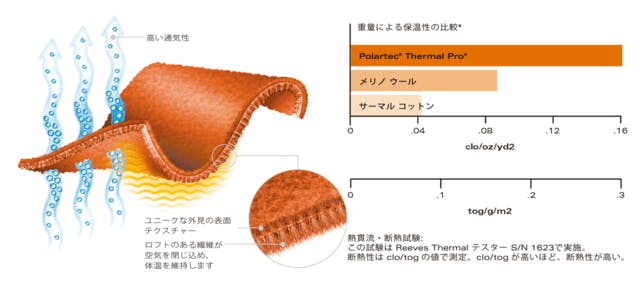 Polartec® (ポーラテック)のThermal Pro®(サーマルプロ)は『熱を逃がさない』高い保温性と『湿度を逃がす』高い通気性、それらに加えて、速乾性と耐久性を合わせ持った、技術的にも視覚的にも優れた断熱生地です。