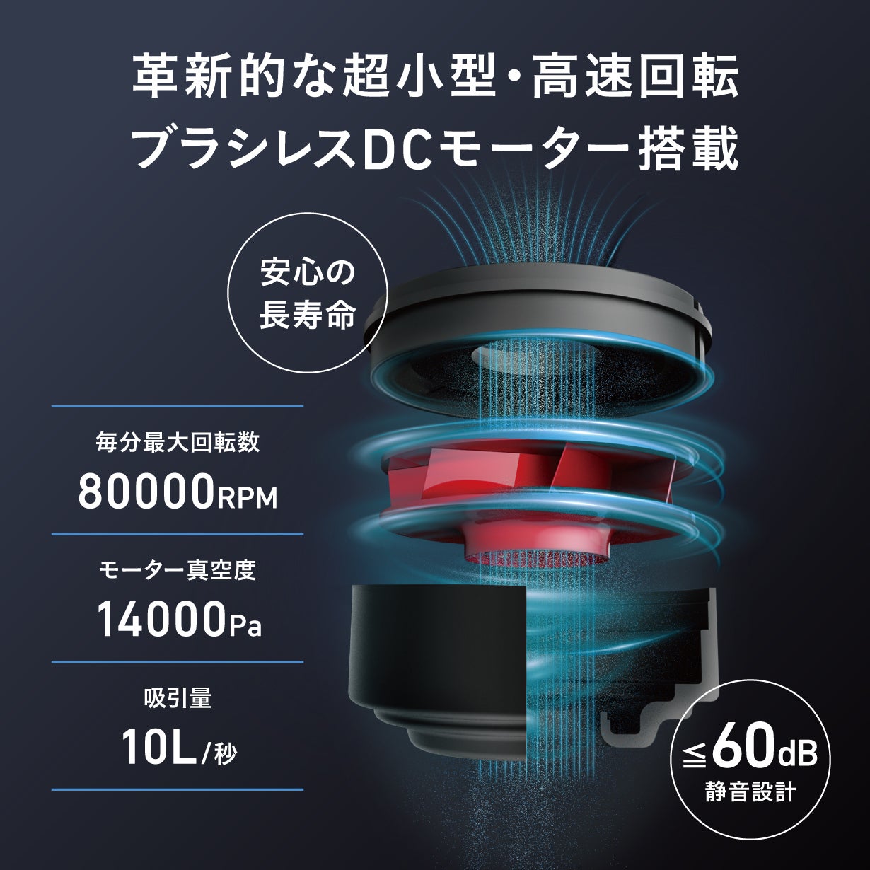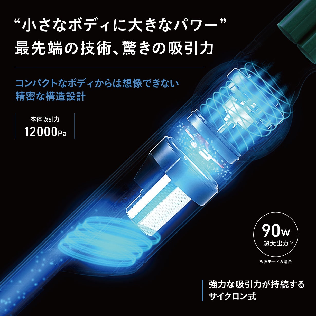 ■毎分8万回転ブラシレスDCモーター搭載、サイクロン式、12000Paを誇る吸引力