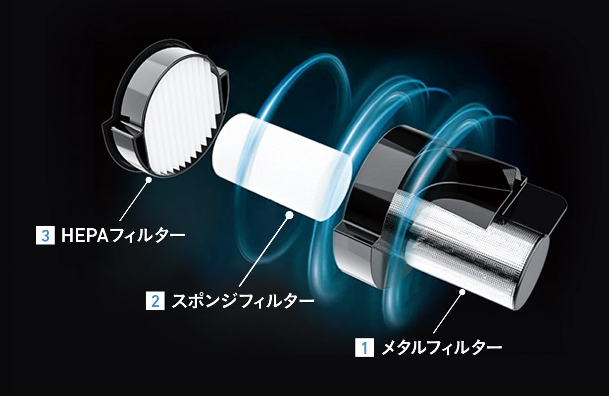 掃除機に吸い込まれた空気はフィルターを経由して排出されます。メタルフィルター、スポンジフィルター、HEPAフィルターの独自設計した3層フィルターシステムを採用しています。そのため、空気と一緒に移動するフケやダニをフィルター内に閉じ込められるため、お掃除する前よりもキレイな空気を排出できます。