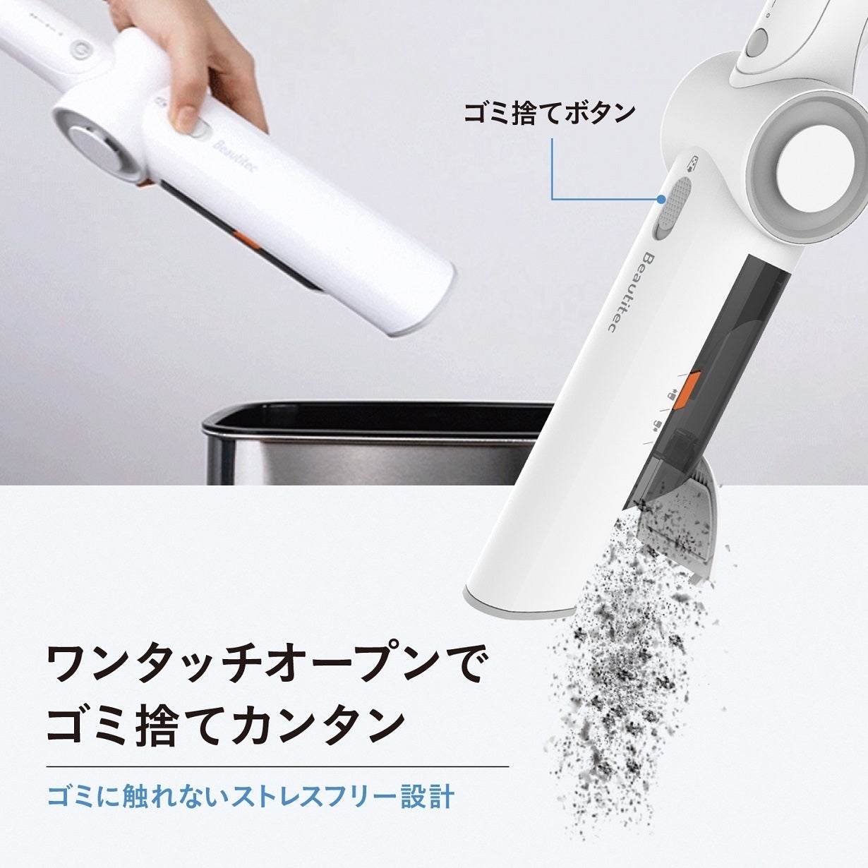 満足のいくお掃除のためには、まずクリーナー自体が綺麗でなくてはなりませんよね。Magic Clean miniは、そのためにストレスフリーで使いやすい設計を心がけました。ゴミ捨てボタンを押すことで、ワンタッチでダストカップの蓋が開き、ゴミを排出することが可能となっており、「片手で吸引、片手でポイ」を実現します。