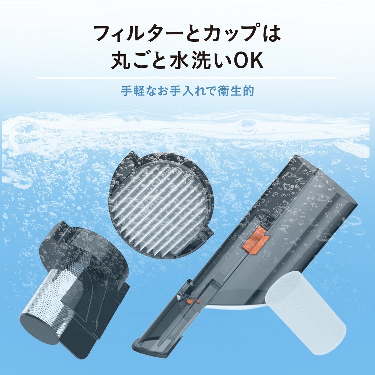 フィルターとダストカップはお水で「ジャブジャブ洗える」から清潔で安心です。