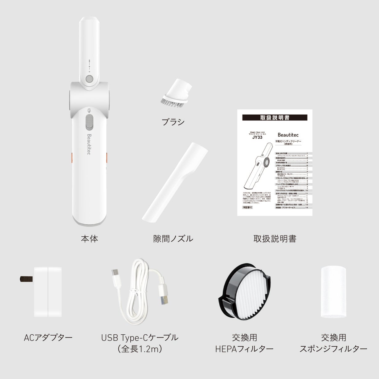 梱包明細: JY33(本体、隙間ノズル、ブラシ、USB Type-Cケーブル1.2m、充電器、保証書付取扱説明書)+交換用HEPAフィルターx1個 + 交換用スポンジフィルターx1個