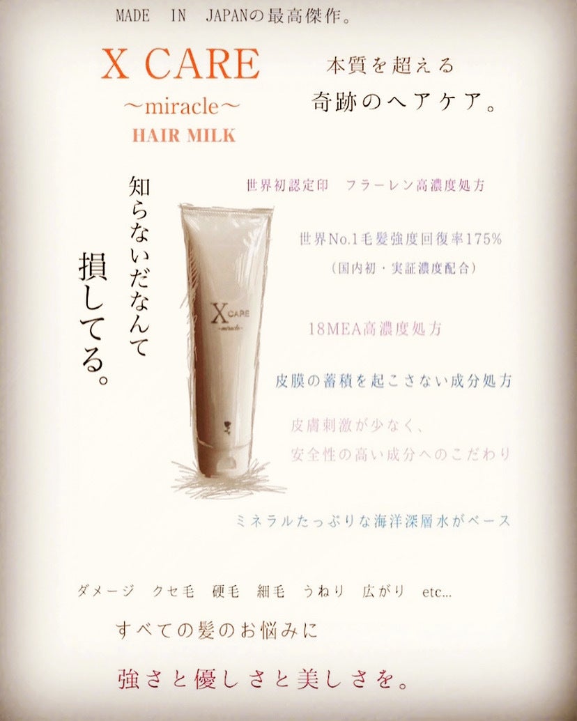 【ラスト1日、よろしくお願い致します】世界が認めた、MADE IN JAPAN ¨X CARE¨12月より以下の26ヵ国で発売となります(アメリカ、イギリス、イタリア、オランダ、スペイン、ドイツ、フランス、トルコ、スイス、オーストラリア、ニュージーランド、インド、インドネシア、シンガポール、アラブ首長国連邦、サウジアラビア、タイ、フィリピン、ロシア、ベトナム、マレーシア、台湾、香港、韓国、中国、日本)既に、いつもお使い頂いてるお客様や目に留めて頂き初めて購入頂いているお客様もいらっしゃいます。本当にありがとうございます☺︎期待以上の実感を感じさせるのがMIRACLEです使えば使うほど、日に日に髪が扱いやすくなります。とにかく、成分にはメチャクチャ拘ってます!補修、保湿のある成分も、もちろん使っていますが、同じ位、拘っているのが皮膜にならない、ビルドアップしない、皮膚刺激が少ないもの、X CARE MIRACLEの本当に凄い所はココなんです!皮膜、ビルドアップになるような成分を使わずこの質感が出るのが他との大きな間違いでMIRACLEなんです!!!応援購入の方には、使い方が間違わないように、3種の使い方を記載してあります、用紙を同封させて頂きますので、最大限効果を実感頂けると思います。始まったばかりですがキャンプファイヤーでのX CAREをよろしくお願い致します
