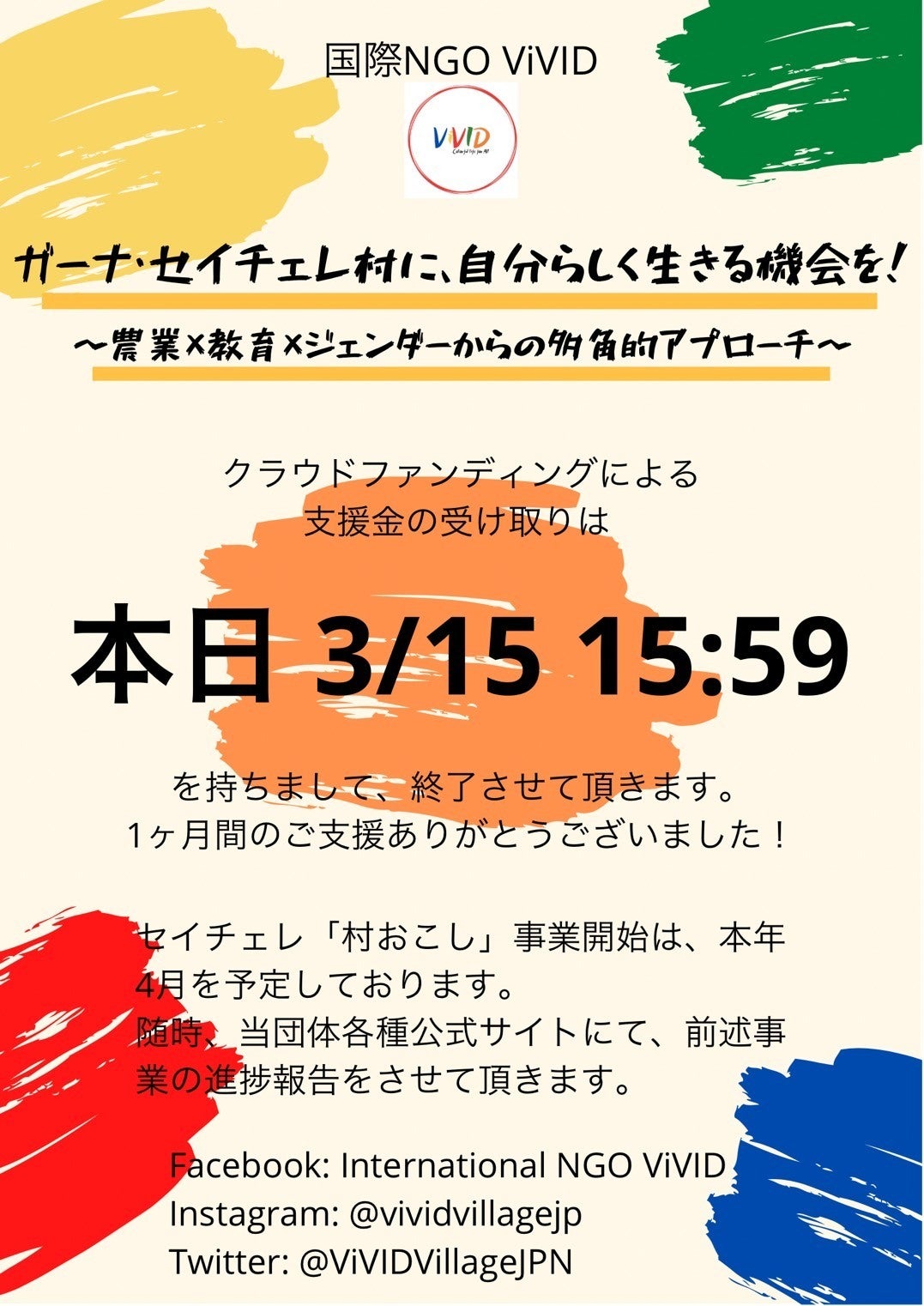国際NGO ViVID代表の蔵田です。 昨日3/15 (月) 23:59をもちまして、セイチェレ村「村おこし事業」のクラウドファンディングを終了させていただきました。最終的に25名程の支援者様から、21万2千円の支援金をお預かりすることができました。皆様の温かいお言葉やお気持ちを現場に伝え、事業を成功させていく責務があると再認識致している次第でございます。支援者の皆様方、この1ヶ月もの間応援してくださりありがとうございました。 我々の村おこし事業は、1年や2年といった短期間で終了するものではございません。セイチェレ村が抱える社会課題に対して多角的アプローチを取っていく中で、既にアフリカやガーナで活動するステークホルダー・アフリカ進出を希望するセクターと連携を図りながら、長期間かけて大きな事業にしていきます。支援者の皆様とそんな「村おこし」事業をこれから一緒に実施できることを心より嬉しく感じます。 「村おこし事業」開始予定日につきましては、現在応募中の助成金の結果が届き次第、ViVIDのスタッフや現場ボランティアと話し合い、確定させ、皆様に公表させていただきます。また、数日前開催したViVIDスタッフ定例ミーティングでは、再度「村おこし」事業のクラウドファンディングを、異なるアプローチから実施してみては?という意見が、ViVIDメンバーの中から出て参りました。今回の「村おこし」事業のクラウドファンディングでは、ViVIDが多角的かつ包括的に地域コミュニティ開発事業を実施していく全体像をお伝えすることはできたと自負しておりますが、我々ViVIDが目指す「村おこし事業」の特徴である多角的アプローチが故に、個別個別の事業につきましては皆様に分かりやすく説明ができなかったのではないかと懸念しております。一つひとつの事業も住民と話し合いを重ね、時間をかけて作り込んで参りました。こちらも後程、改めまして正式に公表させていただこうと思っておりますが、以下3つのクラウドファンディング事業を近日同時期に実施させていただき、支援者様の輪をさらに広げていければと考えております。①「農業分野」からアプローチする「ポポー事業」や「農業講習事業」②「教育分野」からアプローチする「キャリア教育事業」③「ジェンダー分野」からアプローチする「生理用布ナプキン事業」と「性教育事業」今回の村おこし事業のクラウドファンディング支援者様の皆様へのリターンの発送につきましては、3月末を目処に、準備が完成次第発送予定でございます。 改めまして、支援者の皆様、これまで我々ViVIDのクラウドファンディングをご支援頂き、心よりお礼申し上げます。我々ViVIDは、皆様とともに、これからも地域に密着した草の根の活動を続け、アフリカの地域コミュニティ開発に貢献して参りたいと思います。引き続きご支援の程宜しくお願い致します。 国際NGO ViVID代表蔵田克己