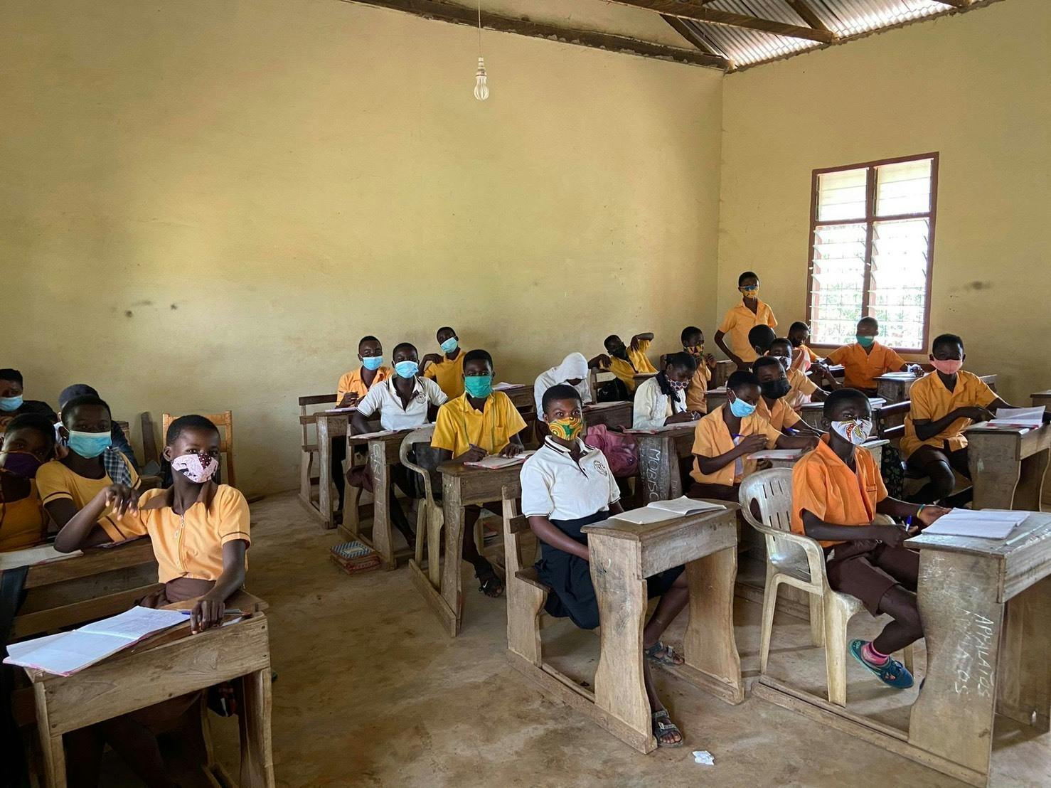 ガーナでは、2020年3月12日に最初の新型コロナウイルス感染者が確認され、3月16日からすべての教育機関が休校となりました。これに伴い、急ピッチでオンライン授業・遠隔教育が整備・提供されていた一方、6月15日以降、いくつかの制約を伴って段階的に学校が再開されました。たとえば、中学3年生の場合、教室あたりの学生は30名までとされ、9時から13時までの短縮授業となっています。10月5日には、高校2年生、中学2年生の授業が再開となりましたが、その他の学年は2021年1月の新学期をもって再開と決定されました。しかし、学校再開後も、校内での大規模な集会やスポーツ活動は禁止されており、ソーシャルディスタンスの確保とフェイスマスクの着用が教育省によって義務付けられています。