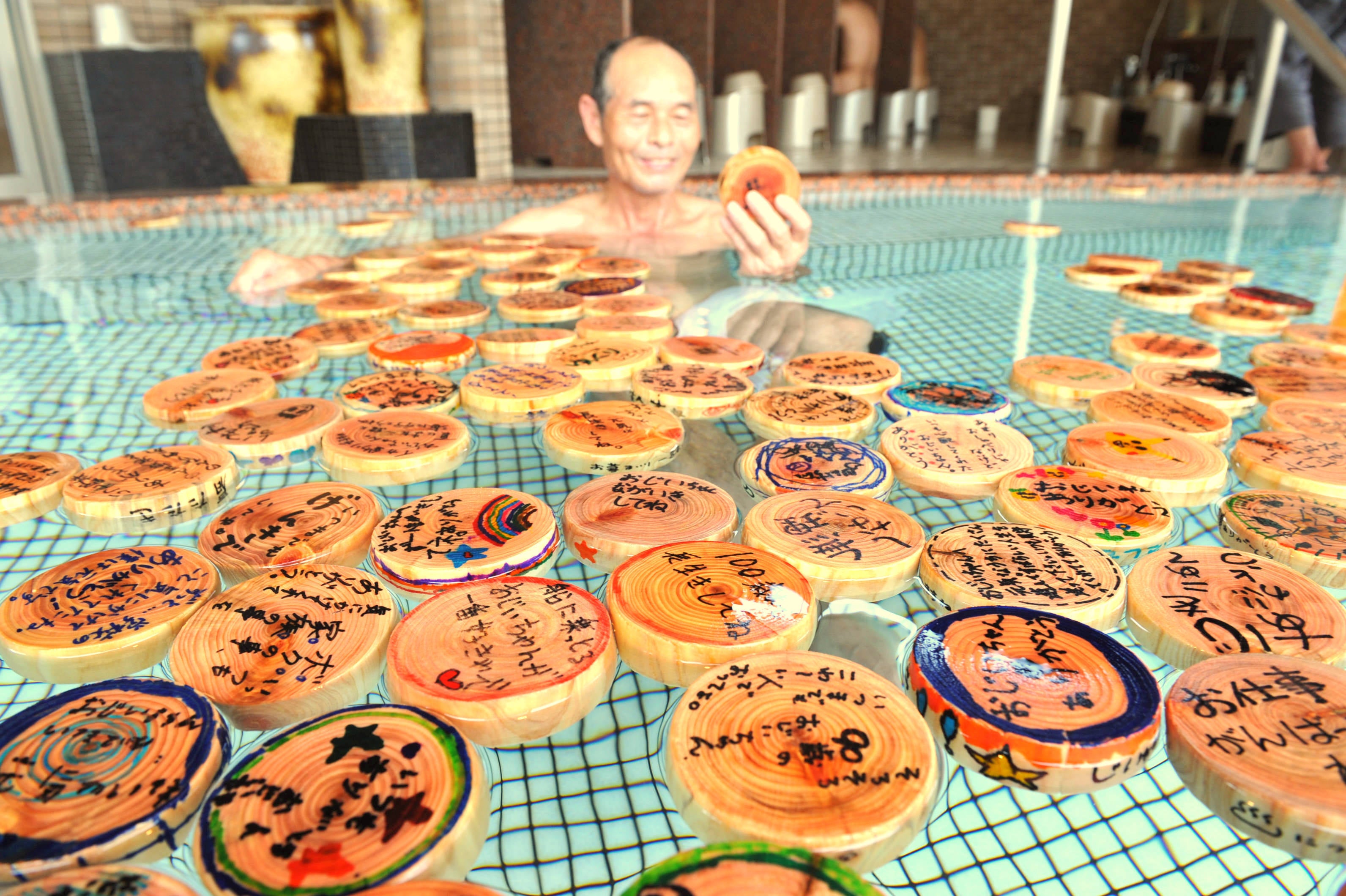 木材需要そのものが低迷している中にあって、特に20〜30年生の細い木が流通されずに間伐されていないことが原因だと聞かされました。これをメッセージウッドとしてお風呂に浮かべ、家族の絆を取り戻し、日本の森の再生を同時に改善する企画。それが「100のありがとう風呂」です。
